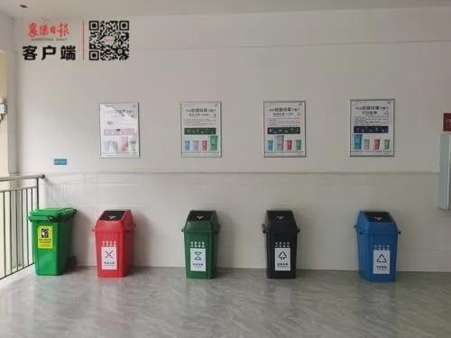 襄阳高新技术产业开发区第一中学教学楼内,放置完好的分类垃圾桶和安装完毕的垃圾分类知识宣传广告 全媒体记者闵佳 摄