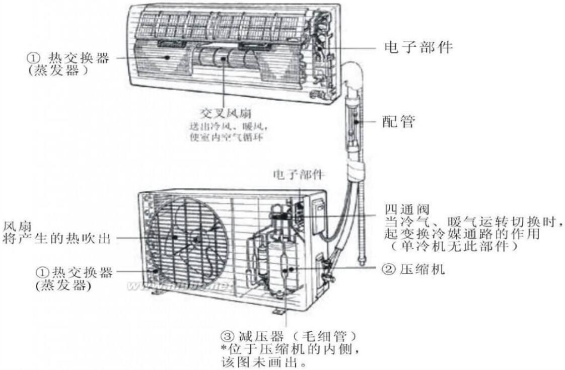 【制热时】 ,通过四通阀改变致冷剂流向,致冷剂在低压气态状态被压缩机压成高温高压气态,送入室内交换机的热交换机进行散热,变成液态,经毛细管节流减压,流到室外交换器通过风扇进行吸热,最后致冷剂返回压缩机中,周而复始。