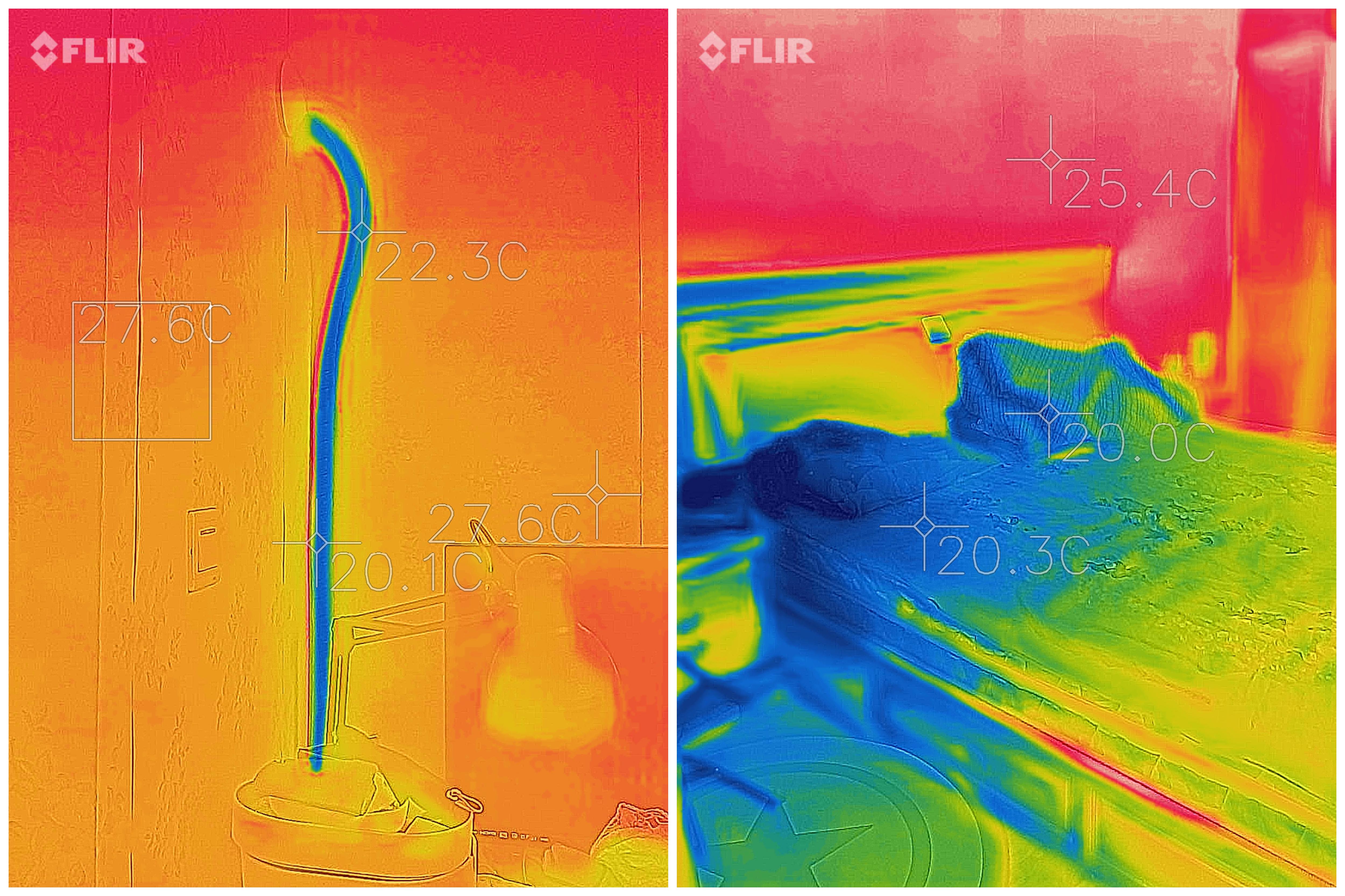 空调制冷的时候它也不吵,就相对的安静地工作着。吹了一会可以看到床面的温度降到了 20℃,墙面温度则接近 26℃,要是在这里美美的睡上一个午觉那肯定很不错。