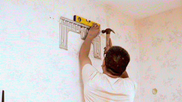 然后安装内机的小哥在墙面上沿着旧空调预留的孔位安装了墙面支架,将前面绑好管道的内机挂上去,就算完成了室内的操作了。