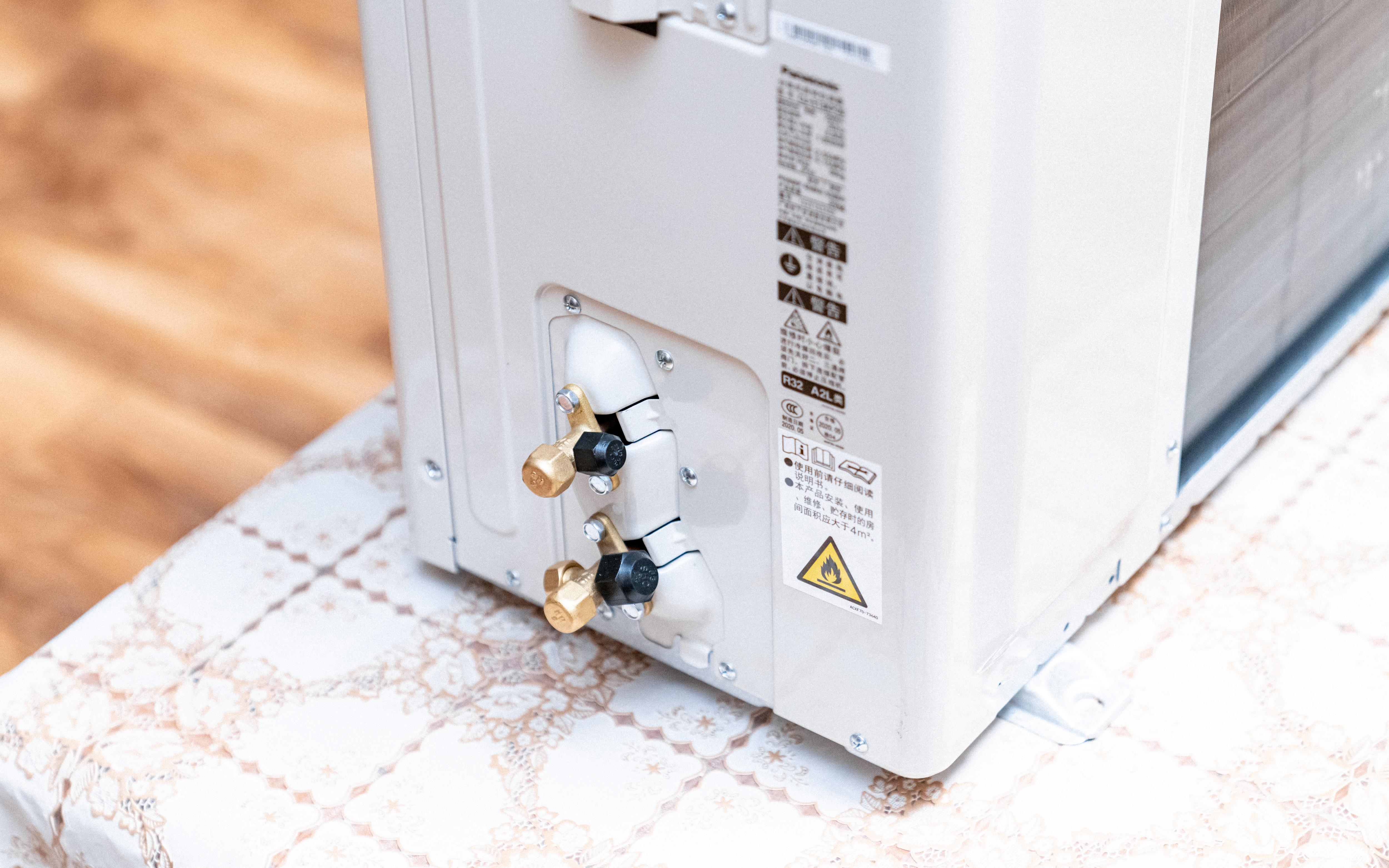 外机的底部预留了安装的螺丝孔位,不过需要注意的是不同品牌的安装孔位可能会有出入,所以还得听师傅的来折腾。最后,在外机左侧是预留的高压管(液态)、低压管(气态)接头。