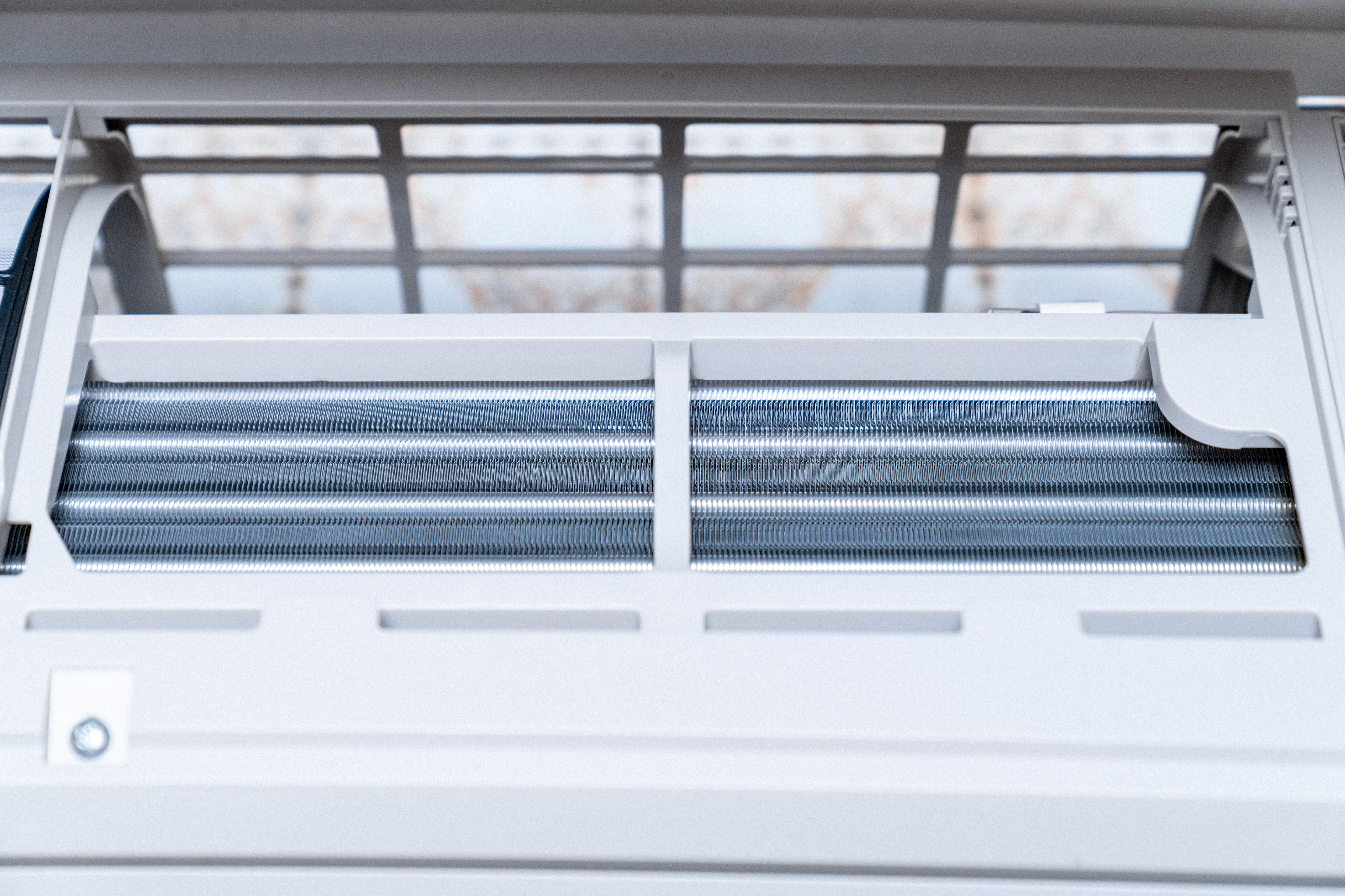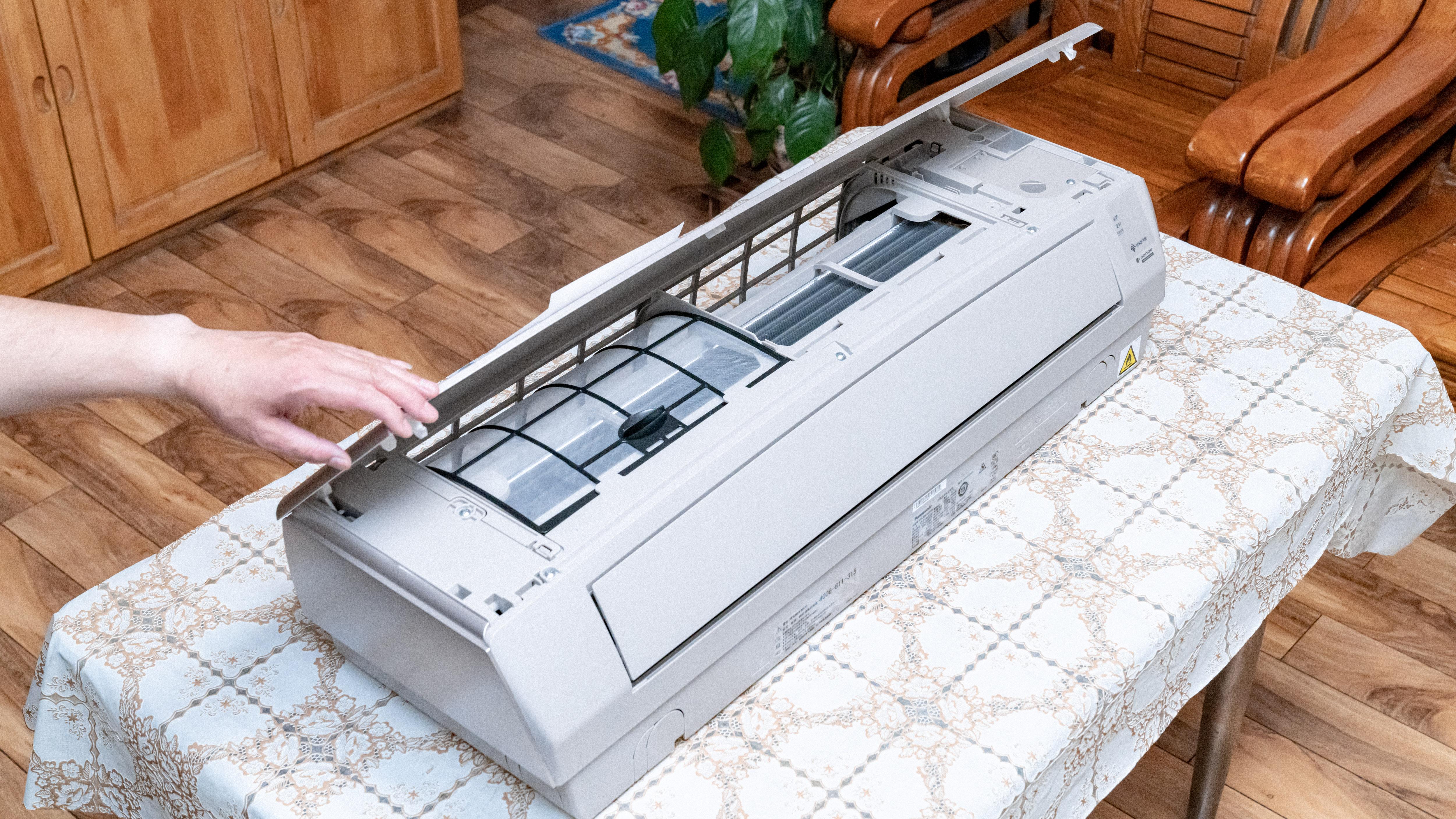 空调右侧的塑料盖板下方是电线的连接的区域,而在滤网下方则是蒸发器,让液态致冷剂蒸发吸热以达到制冷目的。