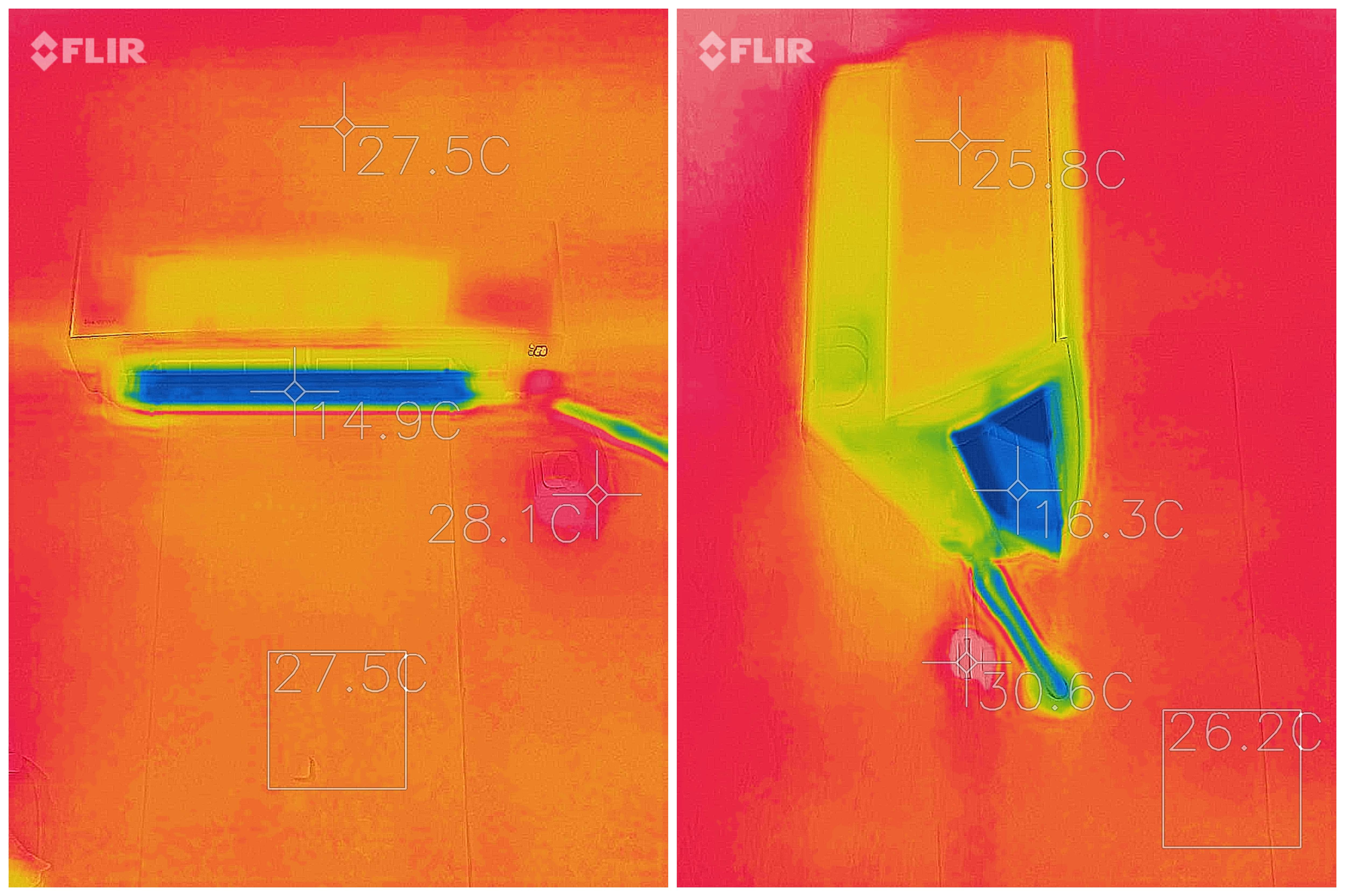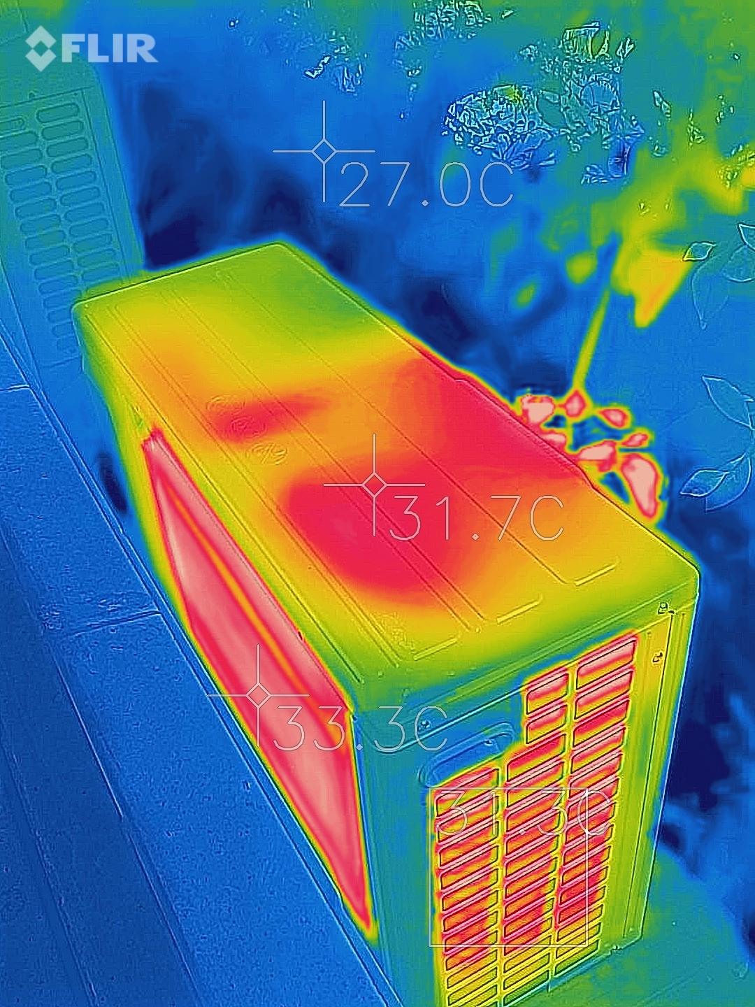 打开刚入手的红外热成像仪就可以看到,松下 D13KP20N 开启强智冷后,出风口的温度大概就是 14-16℃ 左右,管道的温度在20-22℃左右,外机的温度会稍高一点,毕竟这时正在进行散热。