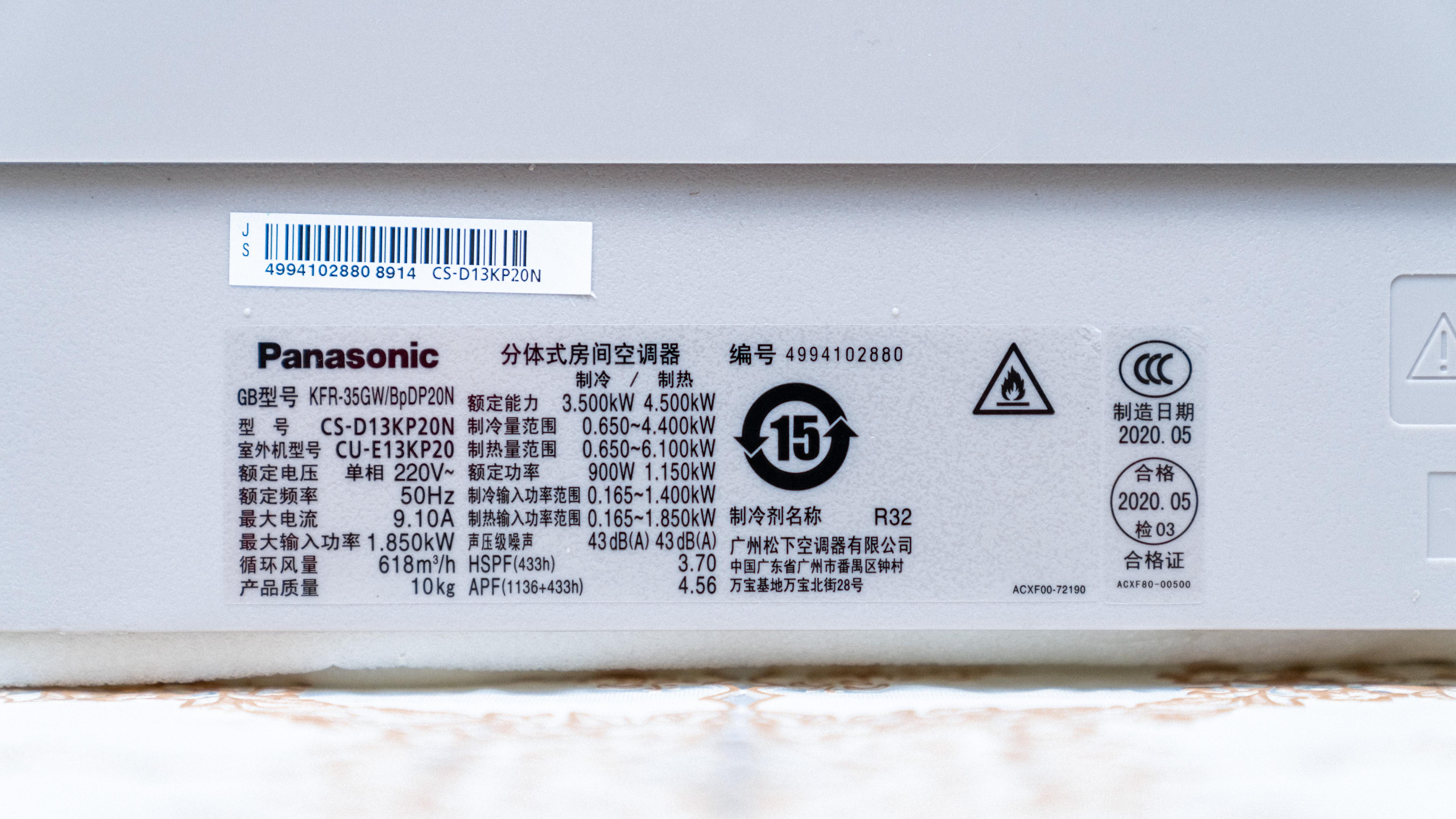 然后在内机的底部还贴有产品的标签,上面覆盖了产品的信息、额定功率等重要信息,可以看到空调是5月份生产,使用 R32 致冷剂,也就是我们常说的冷媒。致冷剂由高压液态变成低压气态的过程中会吸收大量的热量,反之会释放大量的热量,空调就是由此实现制冷,反之则是实现制热。