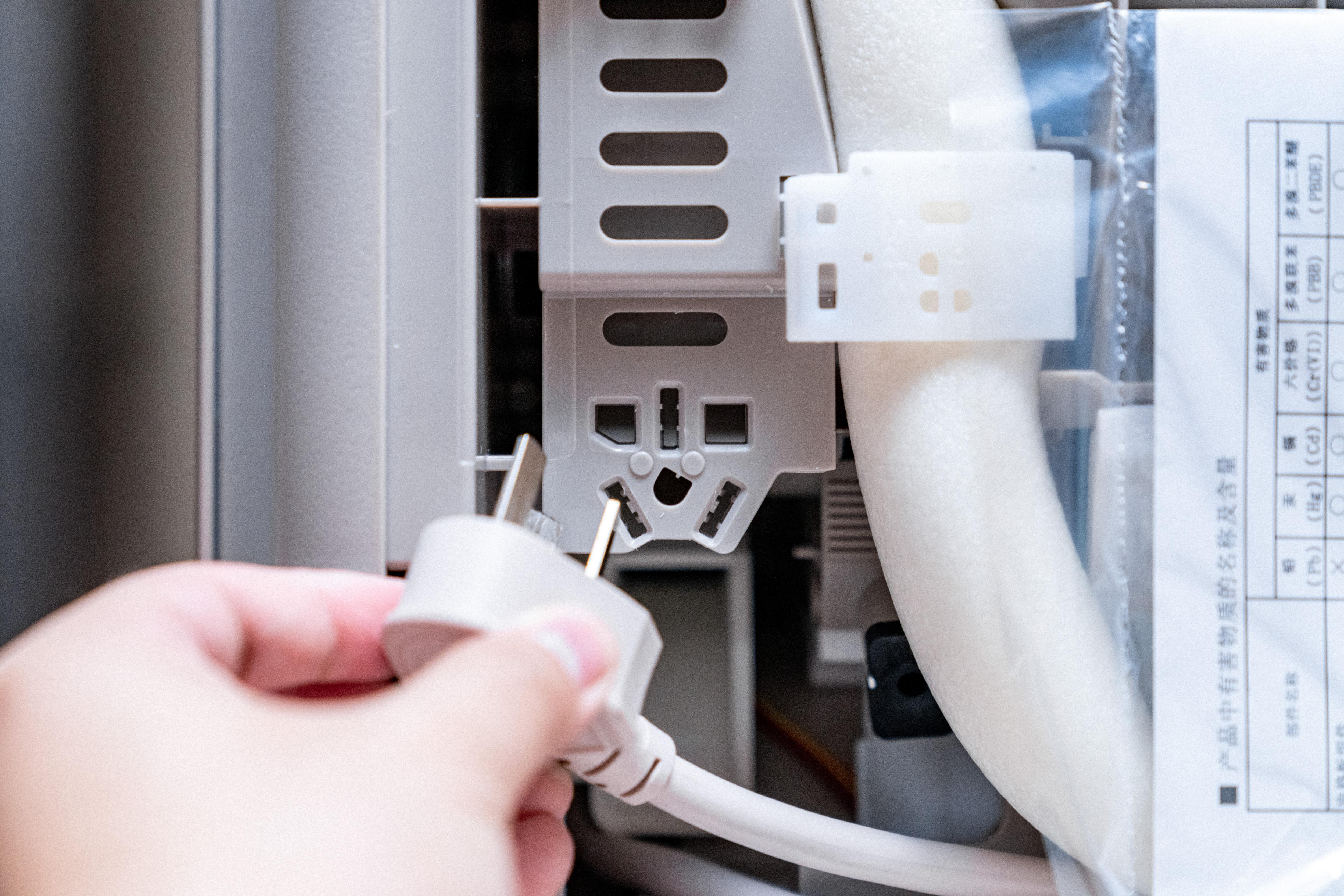 空调的背面区域把管道和墙壁支架都通过蓝色塑料胶带固定在了一起,而且电源的插头还预留了一个插槽,想必是为了避免运输过程中抖动造成的机体损伤,这点比较贴心。