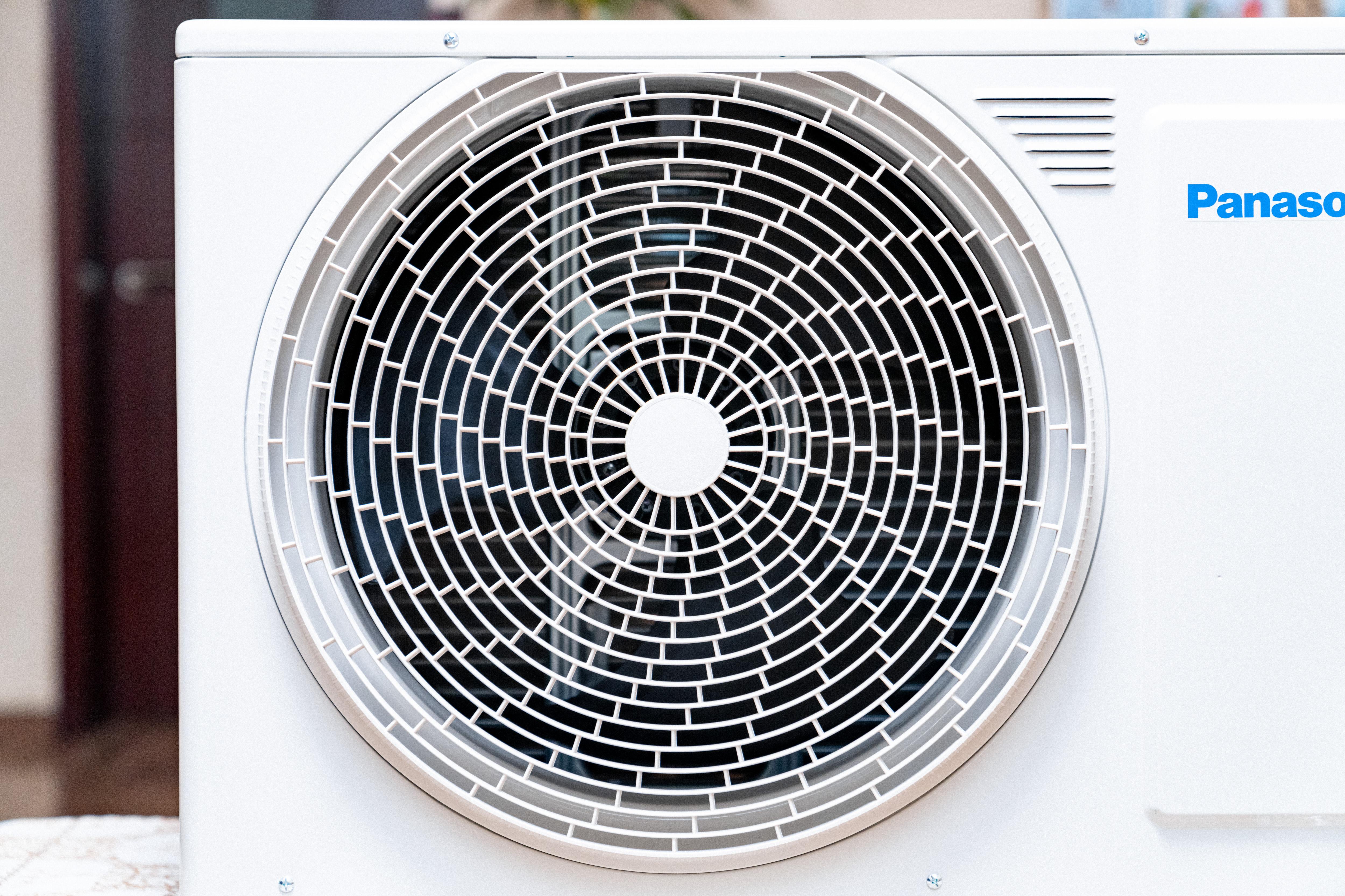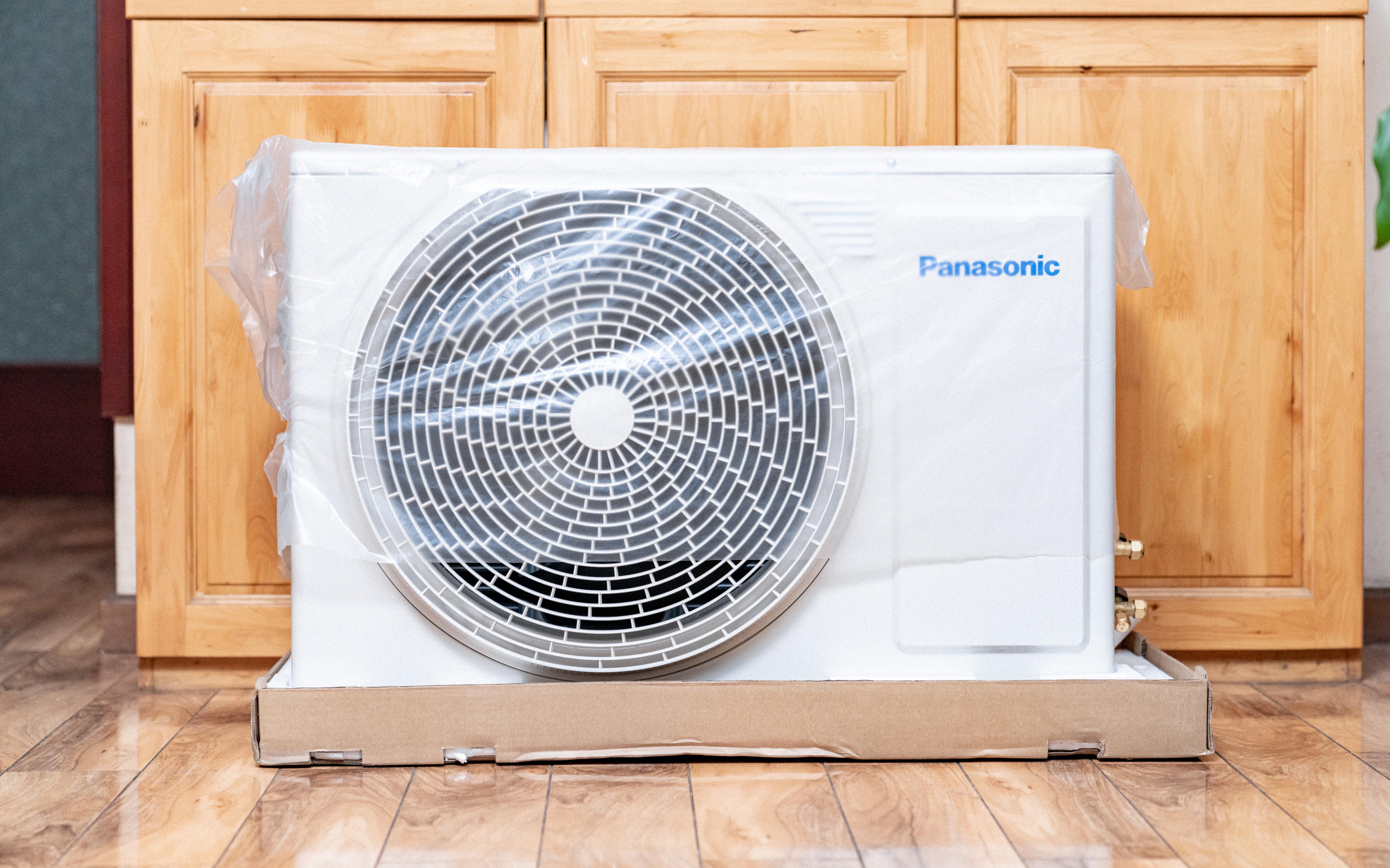 【外机】 :松下 D13KP20N 的外机造型我也比较喜欢,简约大方。首先就是这个大尺寸风机,右侧还有一个“Panasonic”的蓝色标志。