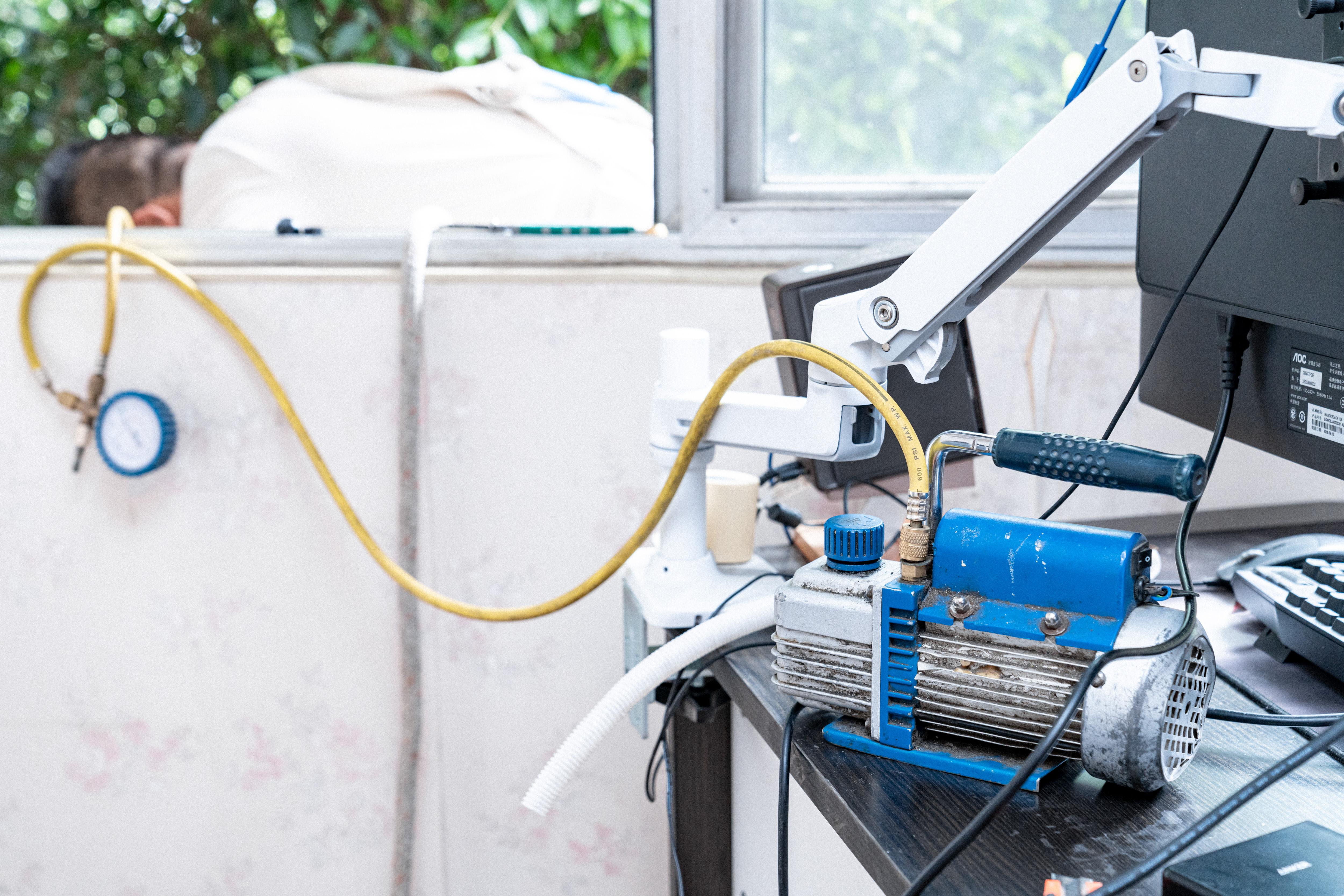 然后安装外机的时候,一个小哥绑着安全绳粘在屋内,另一位则站在空调支架上,将外机的底座同外墙支架相固定。完成安装之后,还需要抽真空。