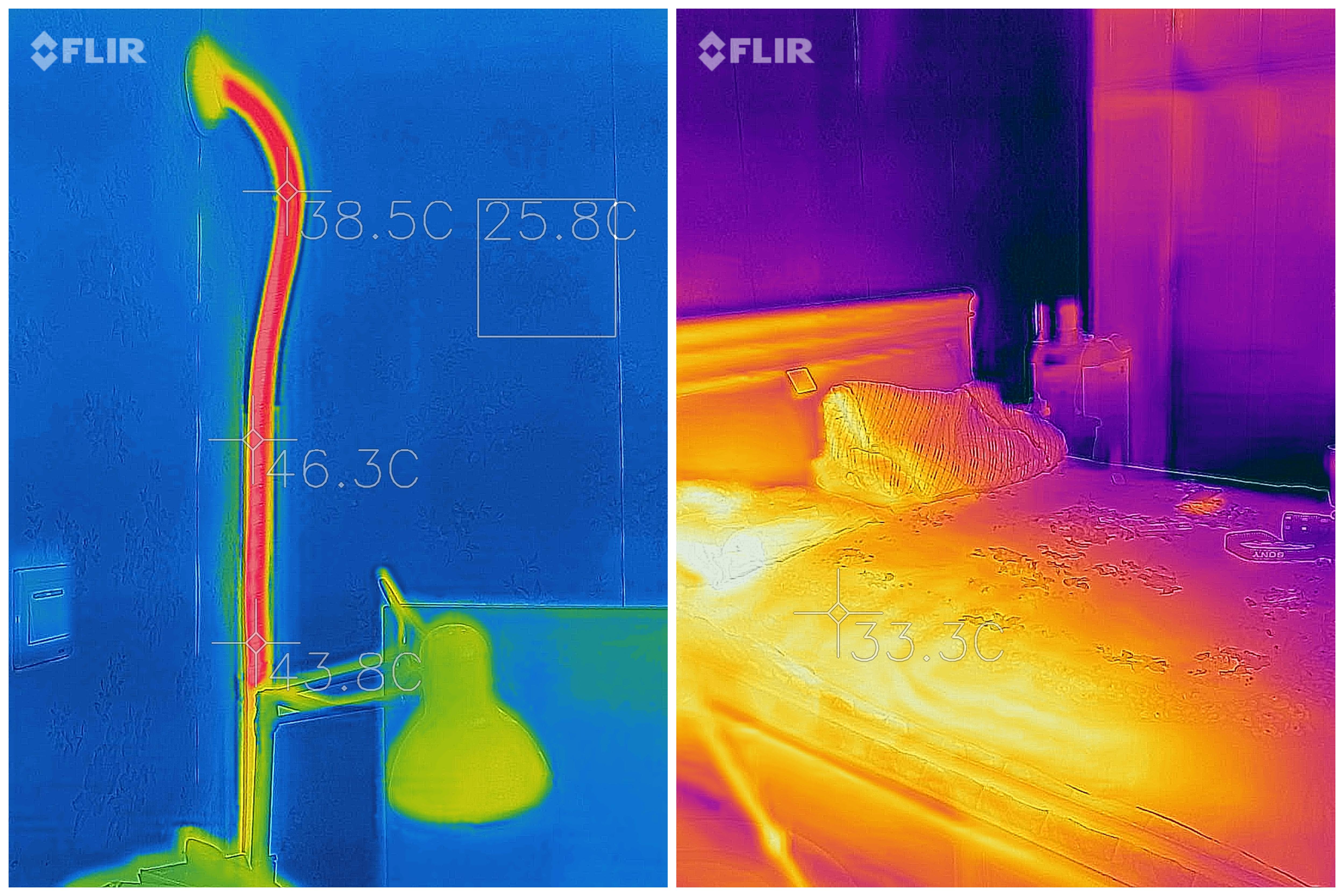 【制热效果】 :而开启强智热后,我把温度调到了 30℃,可以看到与制冷相反,热成像仪画面中的出风口温度就达到了 40-50℃。而此时床面的温度达到了 33.3℃,我是不会躺上去的,毕竟这是铁板烧啊。