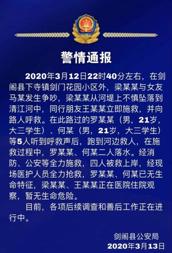 据央视新闻,记者从四川广元剑阁县公安局了解到,2020年3月12日,在剑阁县下寺镇某小区外,梁某某和女友发生争吵,梁某某从河堤上不慎落入河中。此时路过的罗某某、何某等5人听到呼救后前来救人。在施救过程中,罗某某、何某二人落水。经过救援力量全力救援,四人被救上岸。经现场医护人员抢救,罗某某、何某已无生命特征,据了解,二人为在校大学生。其余两人已被送往医院,暂无生命危险。目前,后续调查和善后处理工作正在进行中。