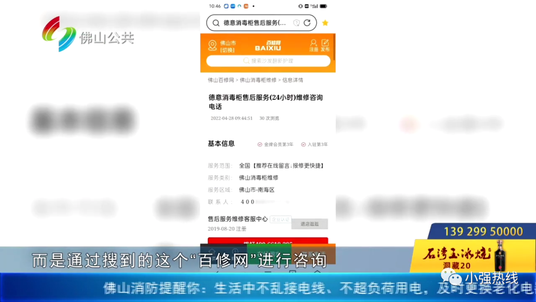 黄女士说,她当时没有搜消毒柜的官方售后电话,而是通过搜到的这个“百修网” 进行咨询,上面显示“德意消毒柜售后服务24小时维修咨询电话” ,于是她就打了过去。
