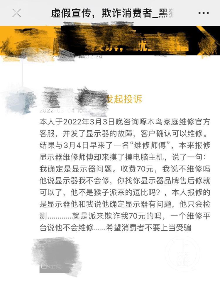 当天,徐先生向啄木鸟家电维修客服投诉后,还以“欺骗消费者、虚假宣传”向黑猫投诉平台投诉,要求退还70元钱。