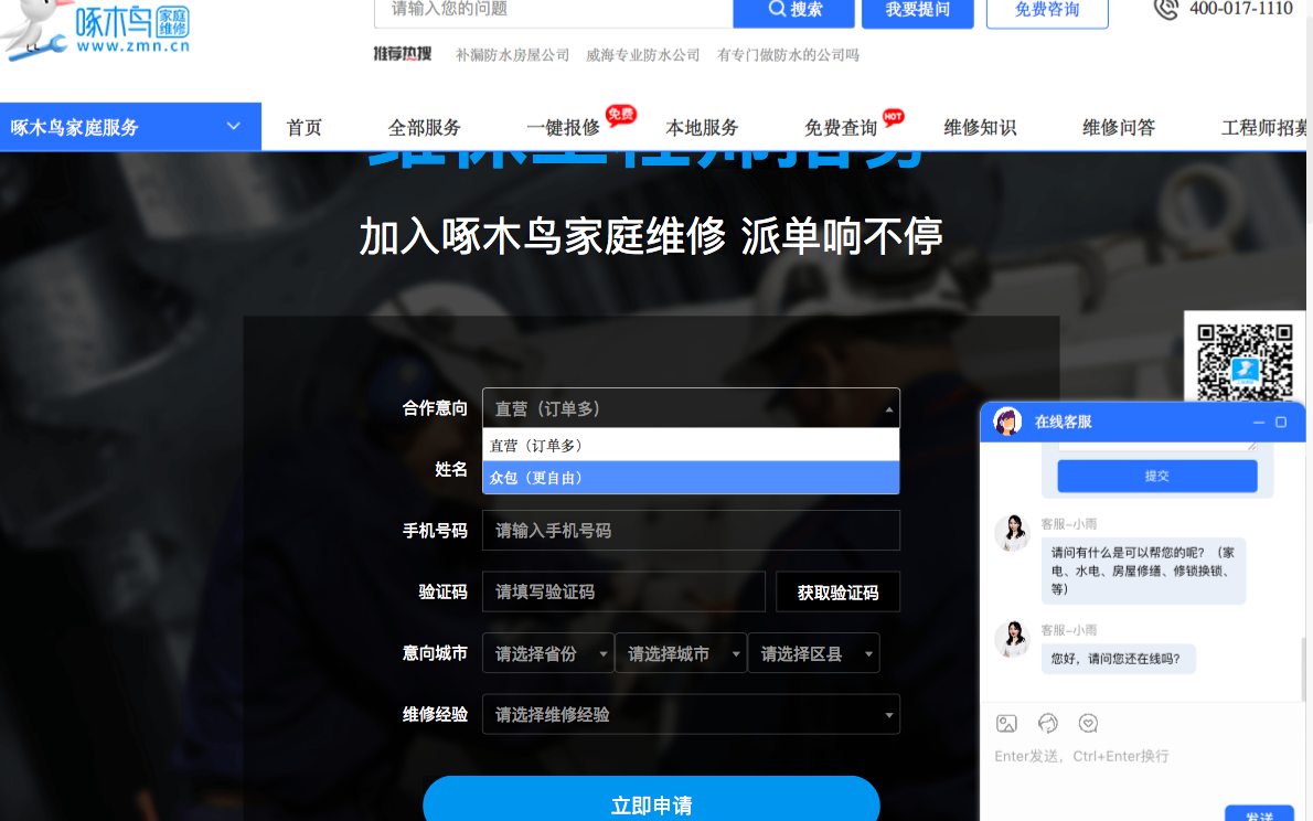 啄木鸟维修公司官网招募工程师入口。官网截图