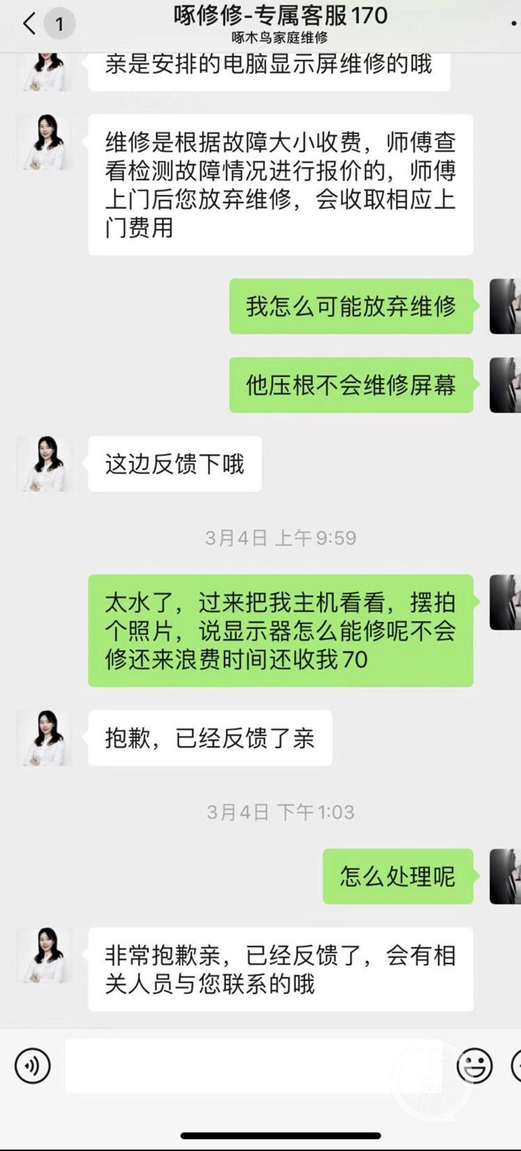 “我向啄木鸟家电维修客服描述了故障现象,还拍了照片发给客服,客服看了回复我说可以维修,收费多少根据故障大小而定。”徐先生说,次日,一名“维修师傅”上门,摸了摸电脑主机,然后收费70元。徐先生认为自己报的维修,不需要检测。啄木鸟家电维修客服派一个不会维修的人员上门服务,还要收费,极其不合理。于是,他向啄木鸟家电维修客服投诉。次日,啄木鸟家电维退还了徐先生的钱。