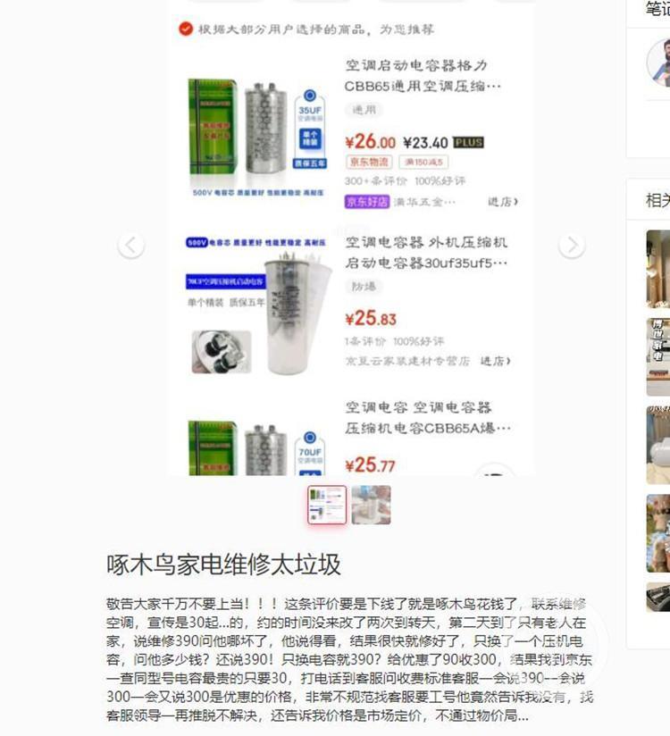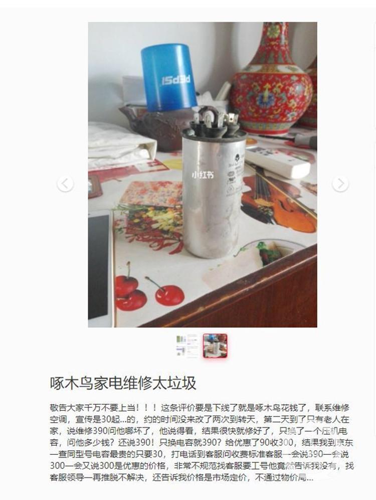 消费者“东京能不热”以《啄木鸟家电维修太垃圾》为题,发帖称家里空调坏了,维修师傅检测是压缩机电容坏了,更换加服务费390元。缴费后,消费者发现收费有问题,因为自己在网上查询到同一型号电容最贵30元。