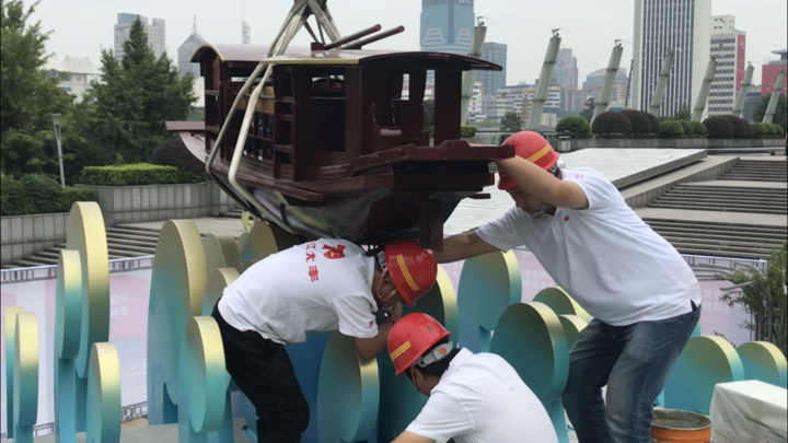 第一次吊装在凌晨1点进行,先是高大山体接合,再是50朵浪花固定、异形LED屏拼装,最后是放上点睛的嘉兴红船。到凌晨6点半,潮涌之江仅耗时4个多小时就完成了组装,创造了“浙江速度”,还受到了中央领导的登车视察。