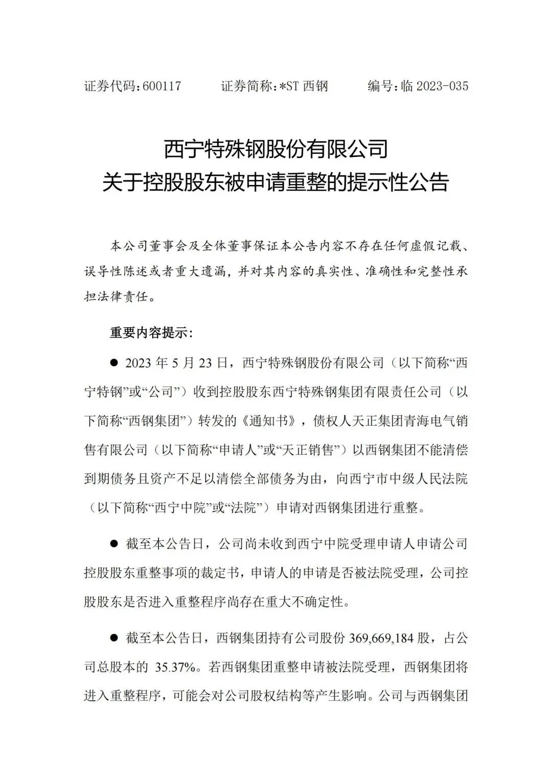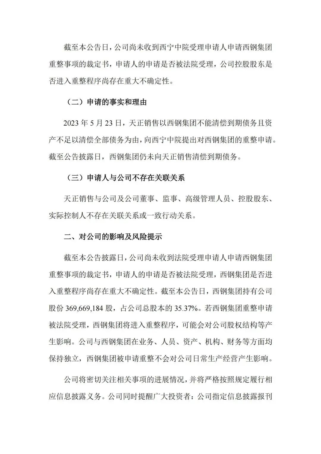 截至本公告日,西宁特钢尚未收到西宁中院受理申请人申请公司控股股东重整事项的裁定书,申请人的申请是否被法院受理,公司控股股东是否进入重整程序尚存在重大不确定性。