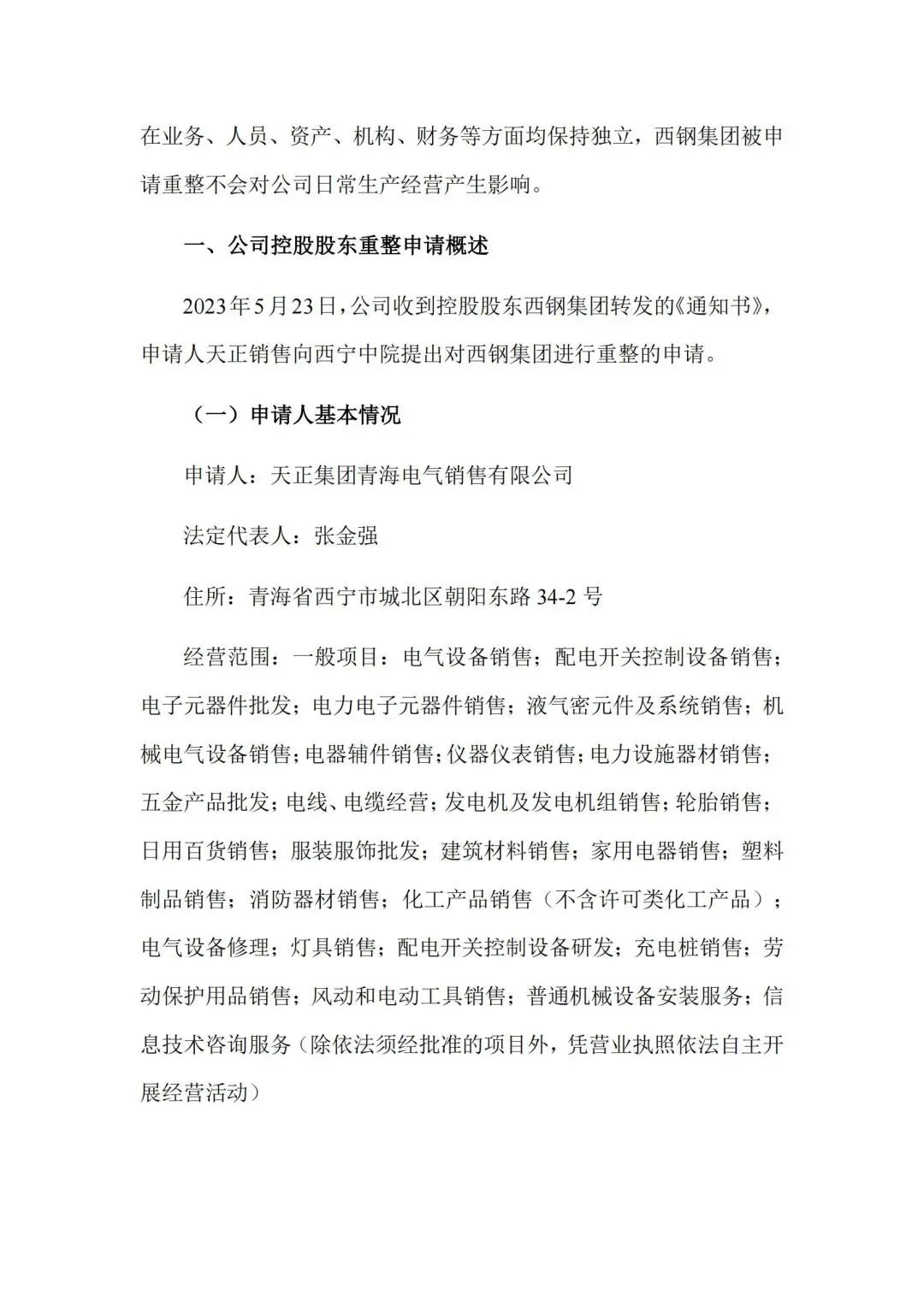 2023 年5月23日,西宁特钢(600117)收到控股股东西宁特殊钢集团有限责任公司(以下简称西钢集团)转发的《通知书》,债权人天正集团青海电气销售有限公司(以下简称申请人或天正销售)以西钢集团不能清偿到期债务且资产不足以清偿全部债务为由,向西宁市中级人民法院(以下简称西宁中院或法院)申请对西钢集团进行重整。