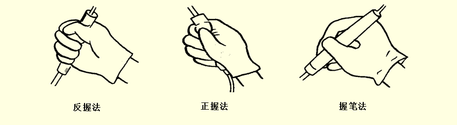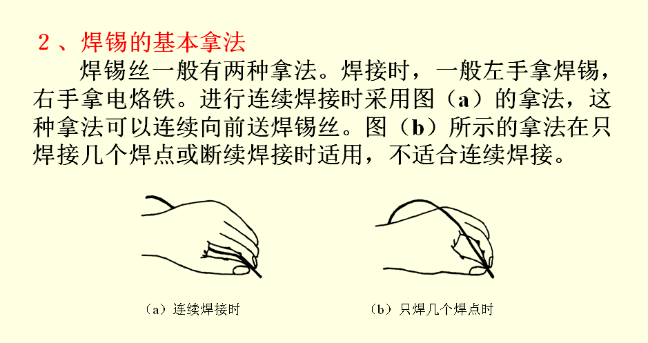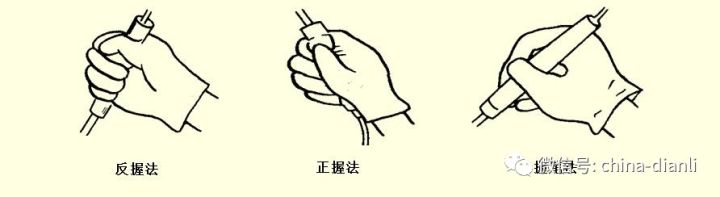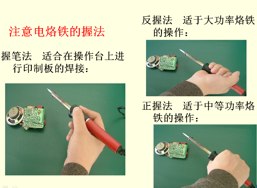 为了人身安全,一般电烙铁离开鼻子的距离 通常以30cm为宜。电烙铁拿法有三种。反握法动作稳定,长时间操作不宜疲劳,适合于大功率烙铁的操作。正握法适合于中等功率烙铁或带弯头电烙铁的操作。一般在工作台上焊印制板等焊件时,多采用握笔法。