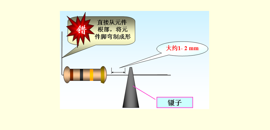 元器件在印制板上的排列和安装有两种方式,一种是立式,另一种是卧式。元器件引线弯成的形状应根据焊盘孔的距离不同而加工成型。加工时,注意不要将引线齐根弯折,一般应留1.5mm以上,弯曲不要成死角,圆弧半径应大于引线直径的1~2倍。并用工具保护好引线的根部,以免损坏元器件。同类元件要保持高度一致。各元器件的符号标志向上(卧式)或向外(立式),以便于检查。