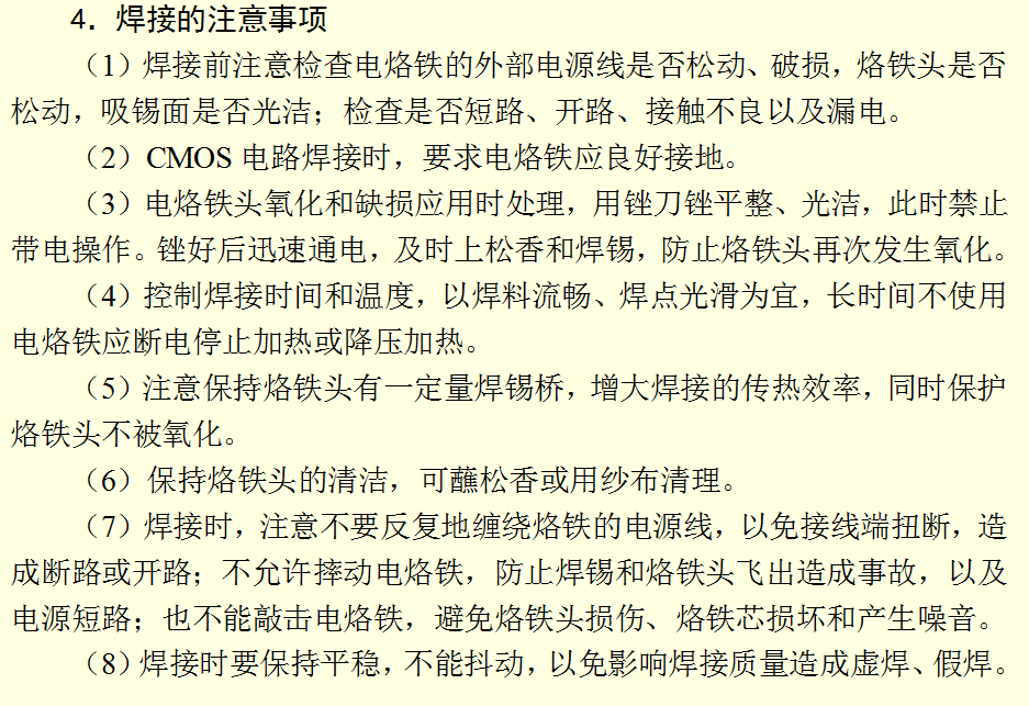 如果电烙铁功率选择过大会烫坏元器件;功率选择过小会出现虚焊或焊锡熔化困难的现象。