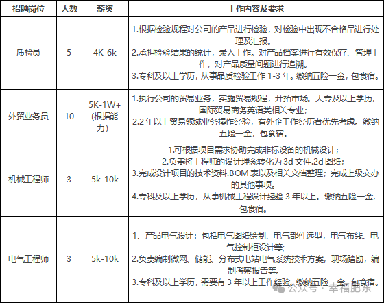 以上岗位要求全职,均享受六险、13月薪、免费食宿、节假日福利、满勤奖、工龄奖、高温补贴、免费体检等福利。