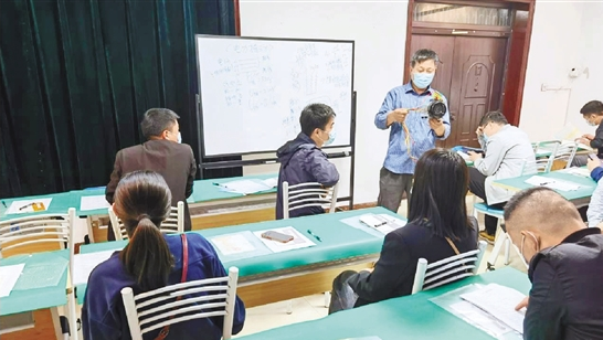 夏志祥(站立者)为电工电器维修技术培训班的学员们上课。照片由受访者提供