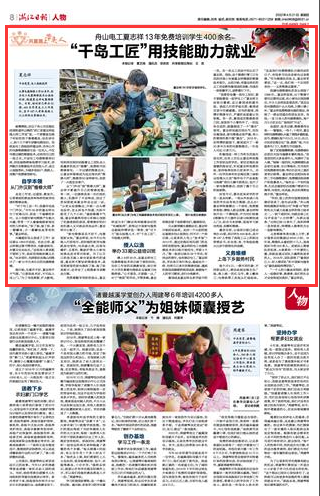 和秦国成一样工作和生活发生变化的,还有上百位从夏志祥技能工作室结业的学员。家住定海区金塘镇的陈安定,听说夏志祥免费招徒,坚持每周双休日前来学习。另外一位学员林军在定海区第三届职业技能大比武“海洋电子产品装配与检测”项目比赛中获奖后,也开了一家电器维修店,找到了属于自己的发家路。