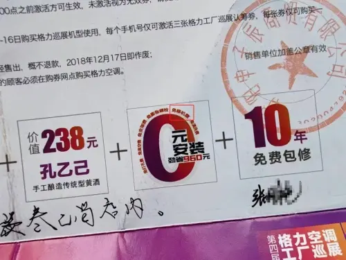李先生告诉二三里,自己于2018年在当地一家店铺购买一台格力挂式空调。当时商家正好在宣传名为“第四节格力空调工厂巡展”的促销活动,参与活动可以领取赠品、享受免费移机及清洗,还有10年免费包修等多项福利。交钱后,李先生的空调也顺利安装。