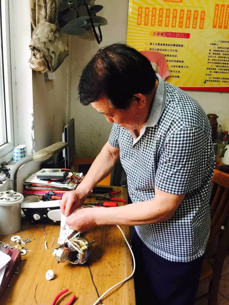 “李师傅,这个电扇帮我修修。”这两天,天气热起来了,居民们的电扇维修有点多,有的只要稍微修下开关就好,有的就得全部拆开来看了,接线,拧螺丝,都是技术活。“居民等着用,我手脚尽量快点。” 李安夫说,有时候忙不过来还要加班。遇到自己也不会的,他有时还会请教别的师傅。他说自己发挥余热,老有所为,心里挺开心的。