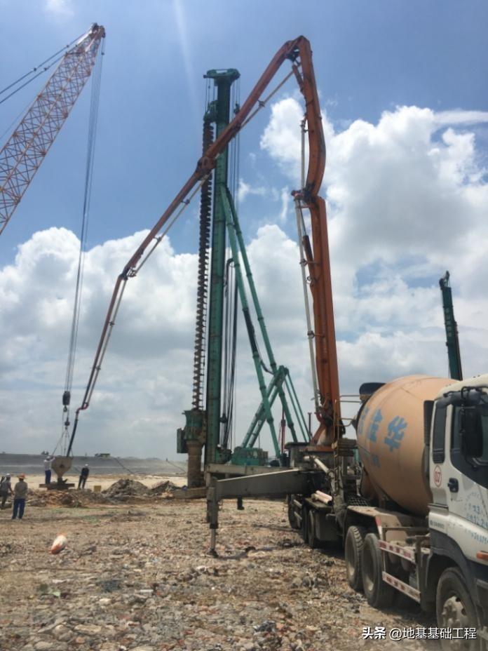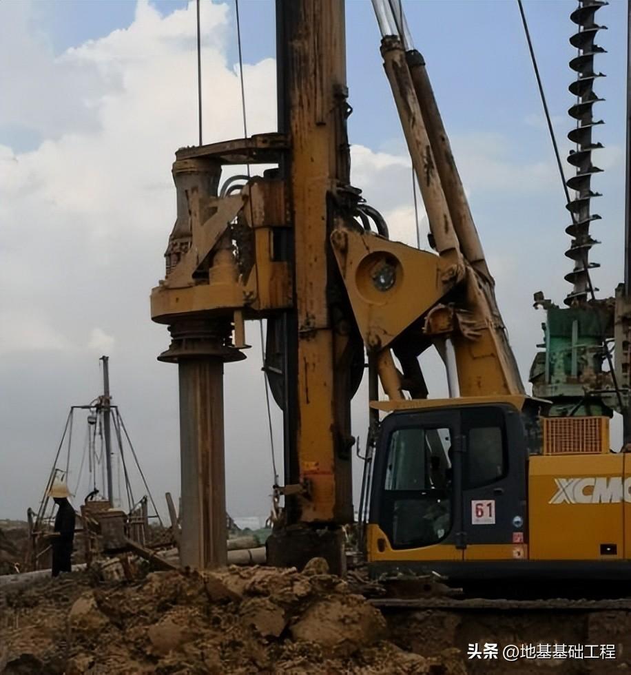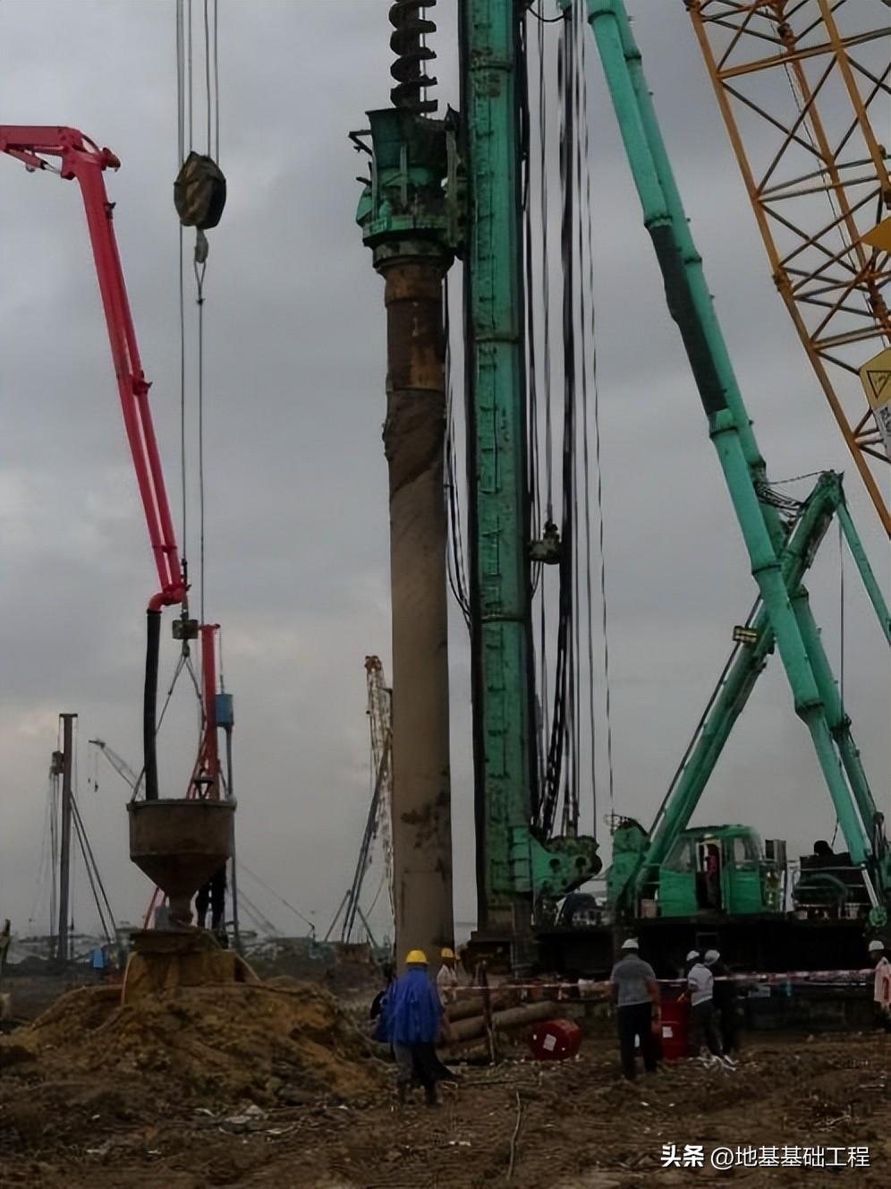 严格控制孔位的测量放线精度,每个孔位均需经过校核后方可施工。在施工过程中为了保证钻孔的垂直度,应随时注意观察长螺旋钻机的水平仪,出现偏差时及时调整 钻机平整度;同时在两个垂直方向上分别吊垂线控制套管垂直度。长螺旋钻机在软弱地层中跟管钻进时,为了防止砂子、淤泥等流进套管,应将套管下沉深度超出螺旋钻头不少于1米。在长螺旋钻机钻至稳定地层后,应多次上下活动套管以便灌注混凝土后起拔,然后再整体移机至下 一孔位。旋挖钻机在稳定地层钻至设计终孔深度后,应采用捞渣钻头将孔底沉渣捞出,完成第一次清孔。在钢筋笼和灌注导管安放完毕后,测量孔底沉渣厚度,如超出设计要求则进行二次清孔,通过优质 泥浆循环的方式将孔底沉渣转换清出,直至清孔验收各项指标合格。灌注混凝土过程中,严格控制砼坍落度在180~220mm范围内,同时确保导管埋深在2~6m之间,防止发生堵管或导管底拔出混凝土面。为了确保桩顶混凝土强度,控制混凝土超灌高度在1m左右。灌注桩完成灌注后,通常在4~6小时内安排长螺旋钻机在混凝土终凝前起拔套管,起拔套管时可根据起拔力大小控制起拔速度。安全措施