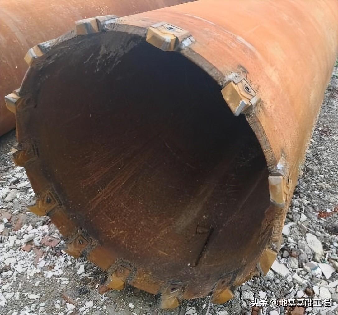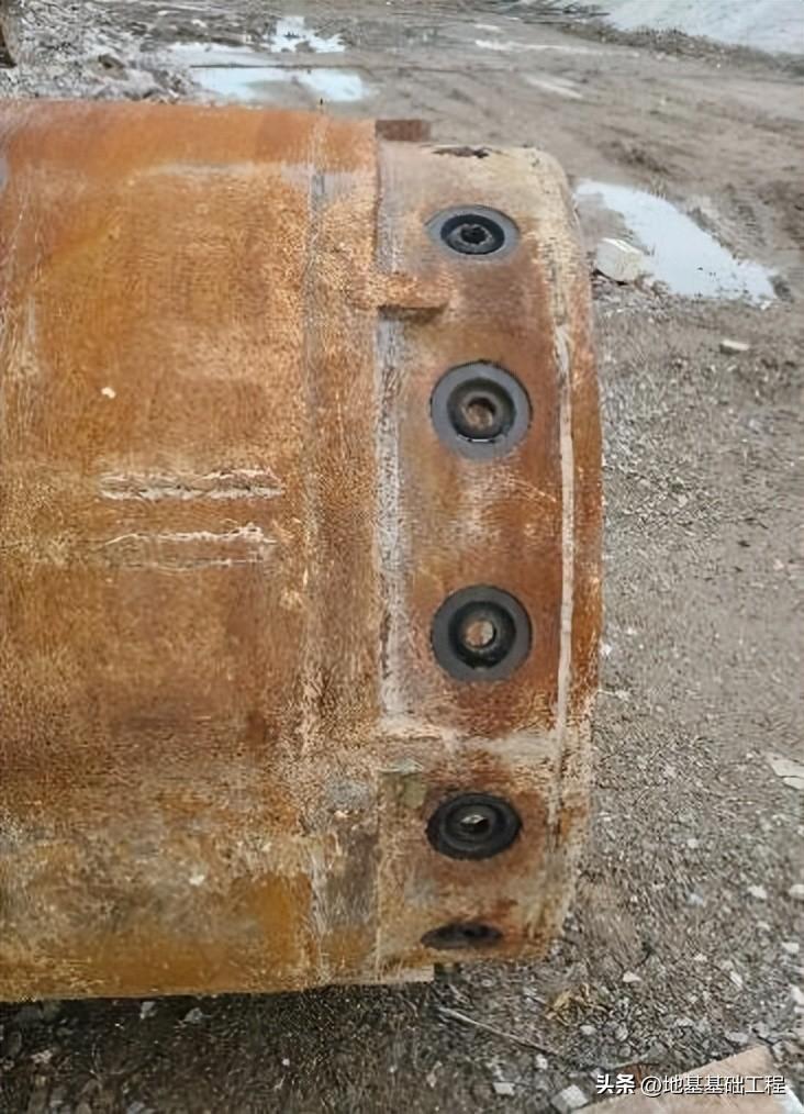 长螺旋钻机套管长螺旋钻机配置的套管采用16mm厚钢板卷制而成,套管内径可根据不同灌注桩设计桩径制作。当需要多节护筒则采用专用节头和螺栓连接固定。为便于套管沉入,在套管底部设有专门的管靴,管靴上镶嵌的合金刀块在套管回转时切削地层有助于下沉。为了防止起拔套管时钢筋笼被管靴挂住一起上浮,通常管靴只镶外刃或中刃,禁止镶嵌内刃。护壁长套管见图 5.2.1-2,套管节头连接见图 5.2.1-3。图 5.2.1-2 护壁长套管结构(左:长套管;中:管靴的合金刀块;右:护筒连接节头)
