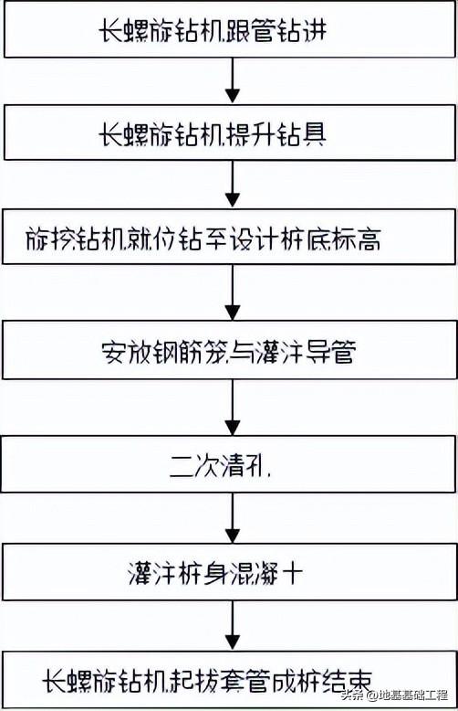 1 长螺旋钻机跟管钻进 2 长螺旋钻机提升钻具并移机 3 旋挖钻机就位钻至设计桩底标高 4 安放钢筋笼与灌注导管