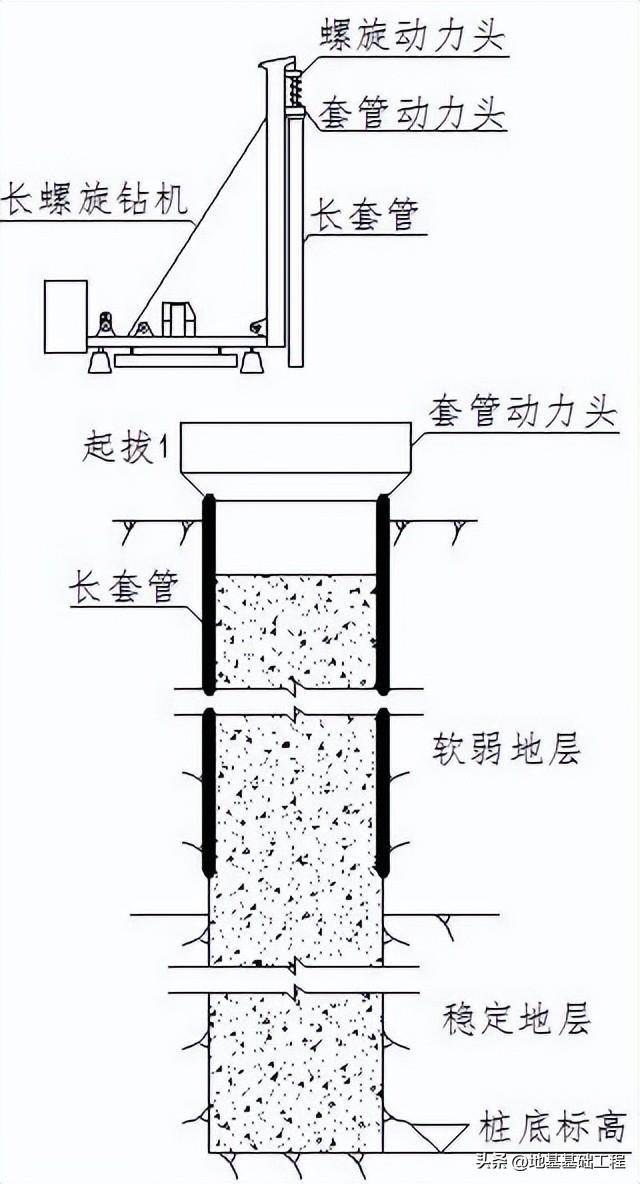 本工法采用专用的长螺旋钻机,实施钻进过程中的同步跟管,直至穿透软弱地层,起到对软弱地层的护壁保护,保证钻孔的稳定。