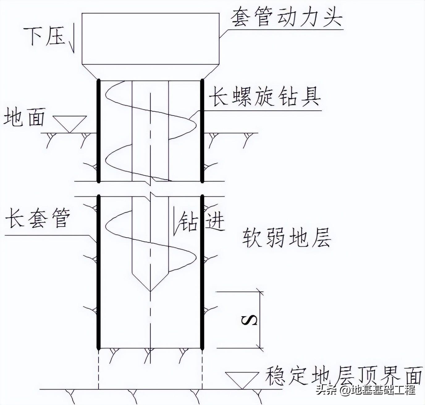 长螺旋钻具钻进取土的同时,套管动力头驱动长套管一边旋转一边下压,完成跟管钻进并形成对孔壁的支护;在软弱地层钻进时,钻进过程保持超前套管护壁,通过控制长螺旋钻机螺旋动力头将套管下沉超出螺旋钻头深度S不少于100cm,见图 5.2.1-7。图 5.2.1-7 长套管超前深度示意图