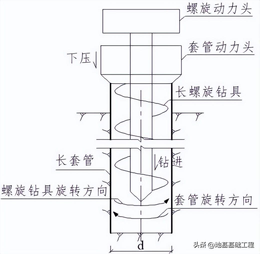 长螺旋跟管钻进系统主要由长螺旋钻机的螺旋动力头、套管动力头、螺旋钻具和长套管组成。在螺旋动力头驱动螺旋钻具钻进取土的同时,套管动力头驱动长套管跟管护壁。长螺旋跟管钻进系统见图 5.2.1-4。图 5.2.1-4 长螺旋跟管钻进系统示意图