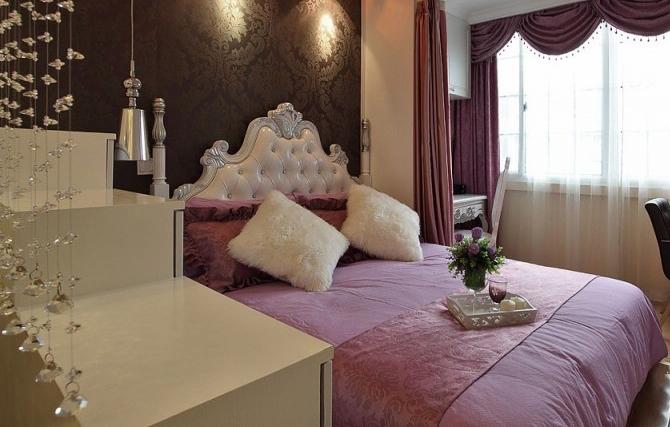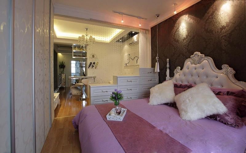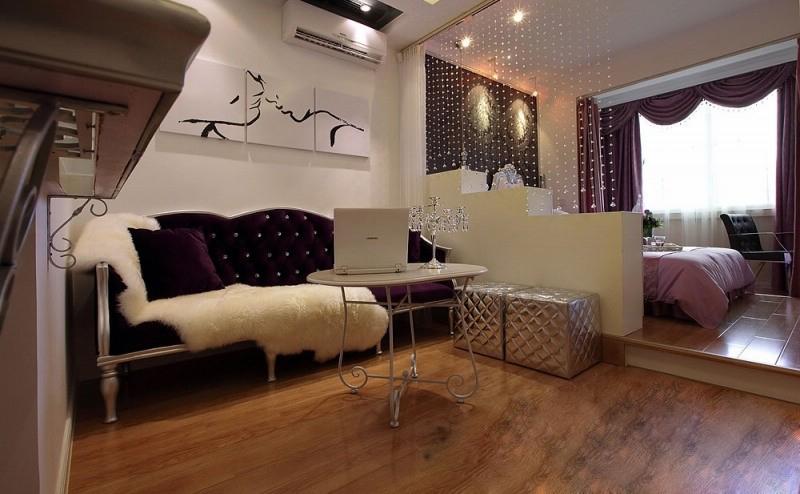通过设计师的设计,小空间也可以凸显奢华大气,客厅和卧室做了简单的隔断,神秘的紫色和华贵的银色搭配更显奢华精致
