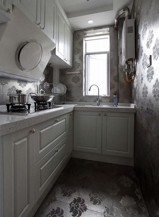 欧式花纹的瓷砖构成了墙砖与地砖,统一的材质即延伸空间又在形式上形成统一,采用白色橱柜与石质台面的结合,使得这个小空间也具有精致与大气