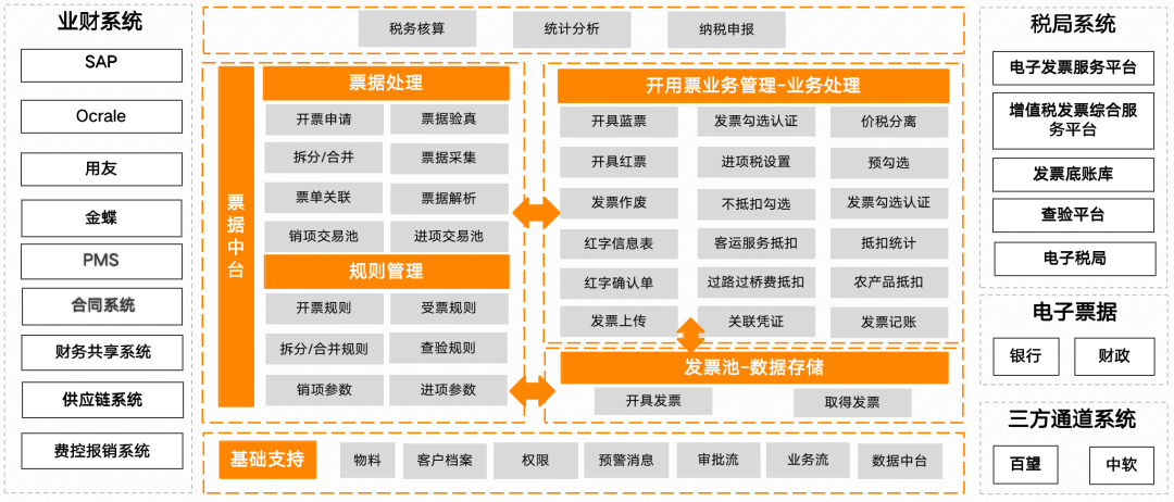 票据中台负责连接外部系统,业财系统需要开票时,可将数据传入票据中台,通过票据中台的票据处理和规则处理,形成标准的开票和用票数据,进入开用票业务处理模块,进行发票开具或发票勾选抵扣等业务处理。最终所有开具发票和取得发票均在发票池中存储,以备各个系统及模块调用和分析。