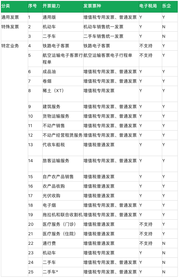 不同开票能力,电子税局和乐企的支持情况如下表所示(截至2024年1月1日):
