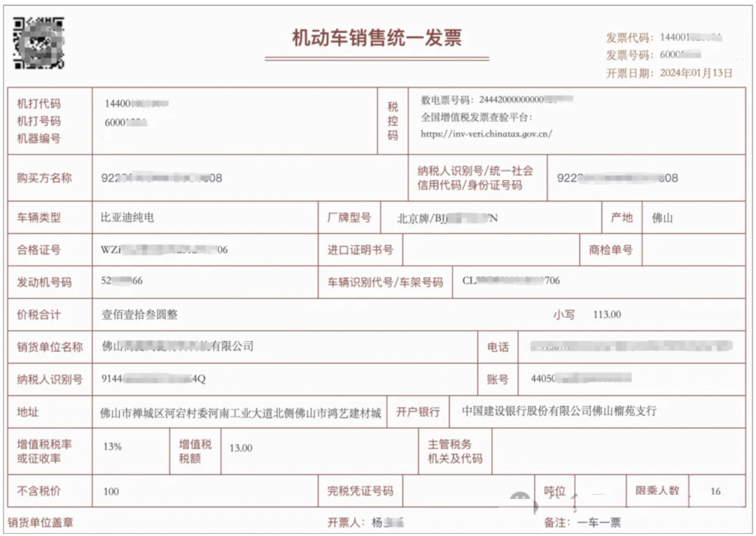 报废产品收购特定业务发票,销售方为自然人,开票时需对自然人信息进行校验,包括但不限于身份证信息等(其他证件亦可)。报废产品收购特定业务发票,单张开票限额不允许超过500万元。发票开具完成后,示例如下:
