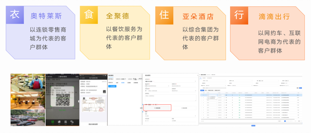 如下图所示,对于发票系统来说,客户群体既有奥特莱斯、全聚德、亚朵酒店、滴滴出行这类B端企业,也有在这类场所消费的消费者。