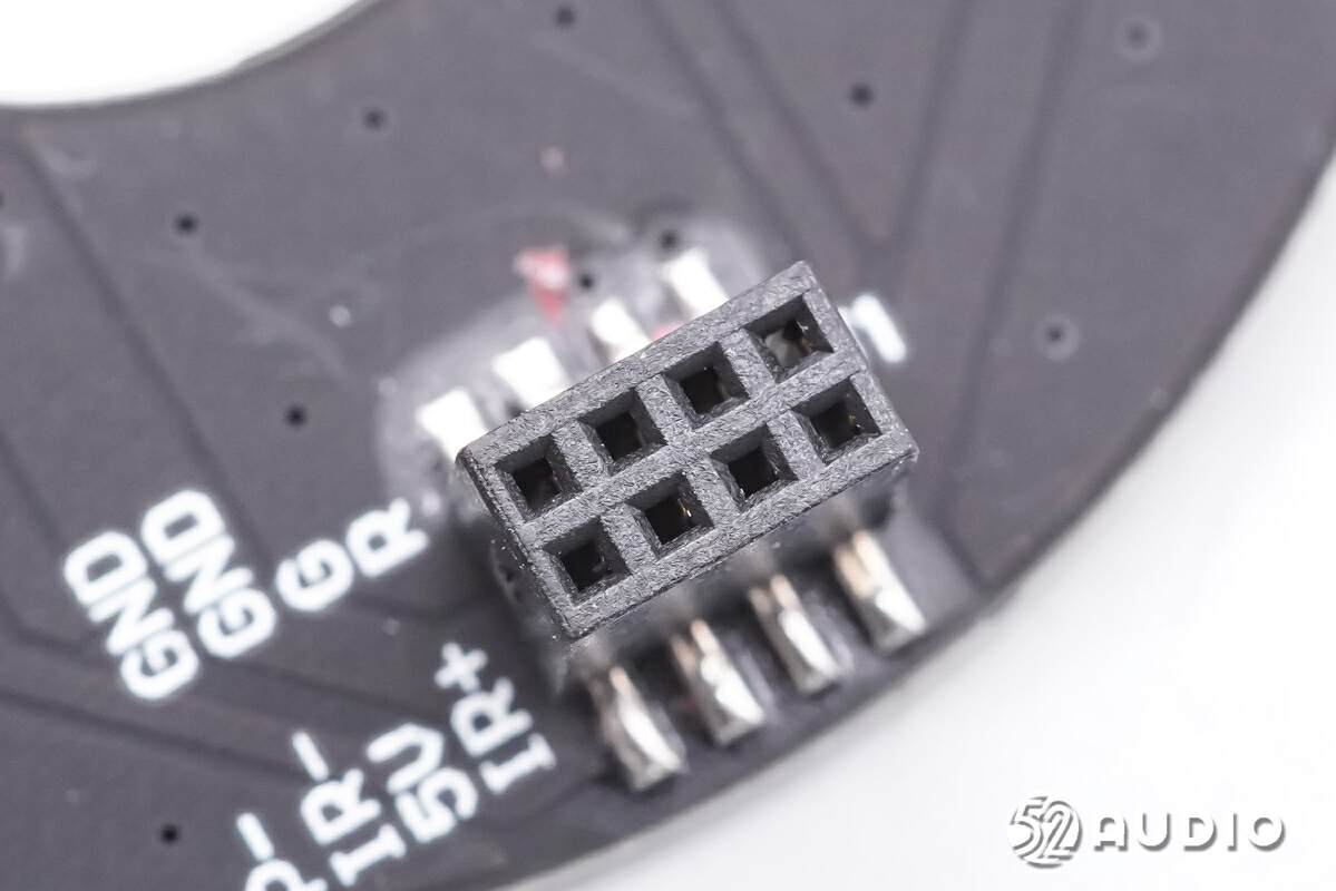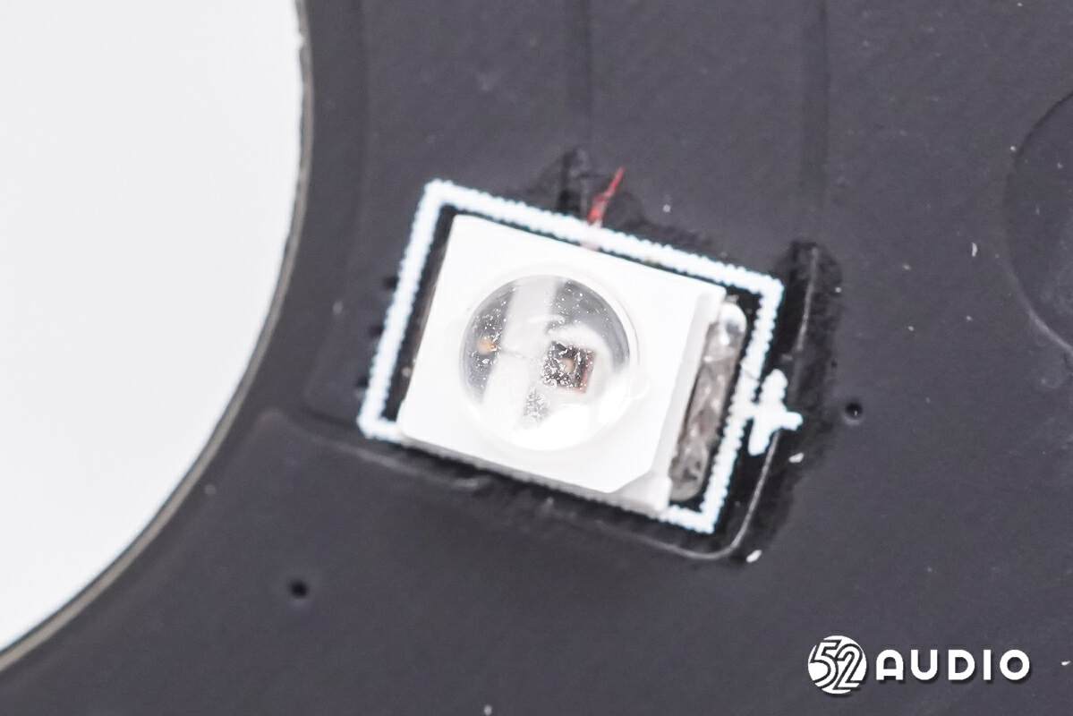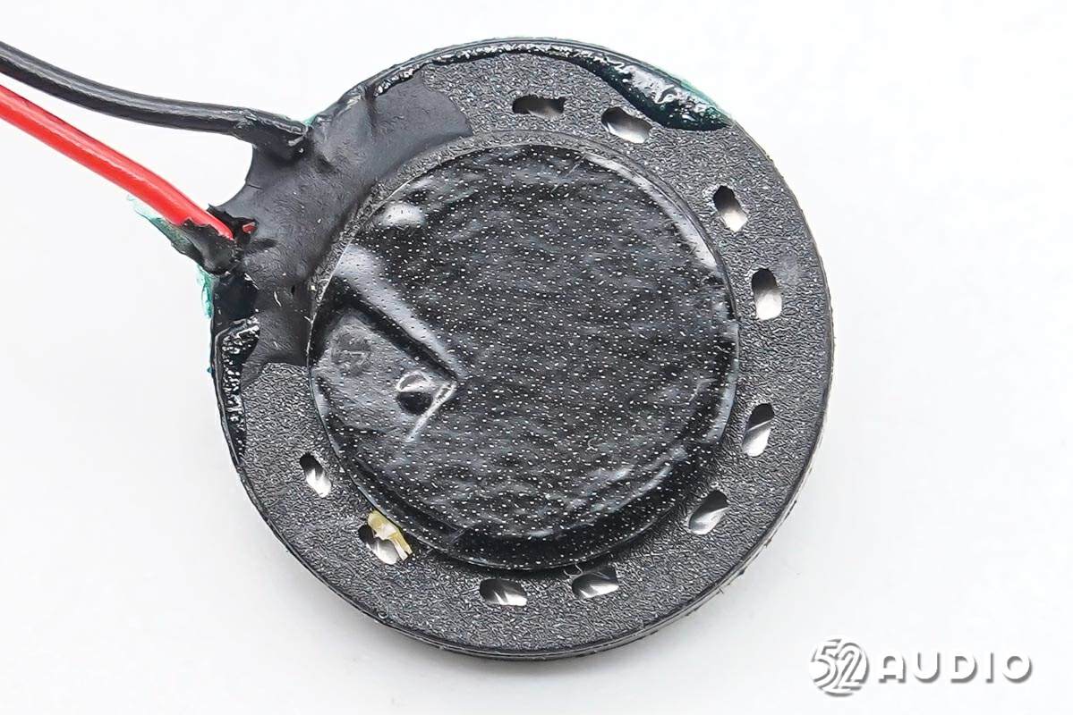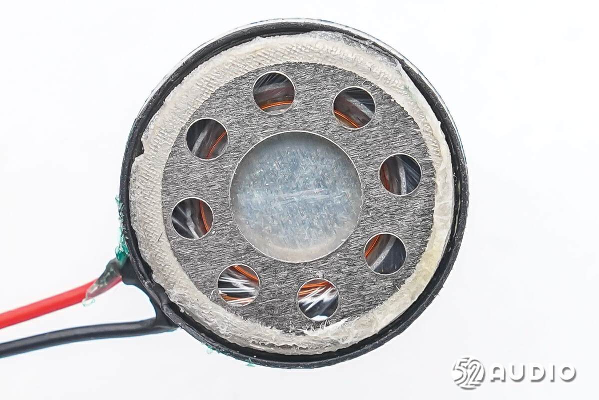 扬声器背面特写,导线焊接,打胶防护。边缘一周设置调音孔,提升音频性能。
