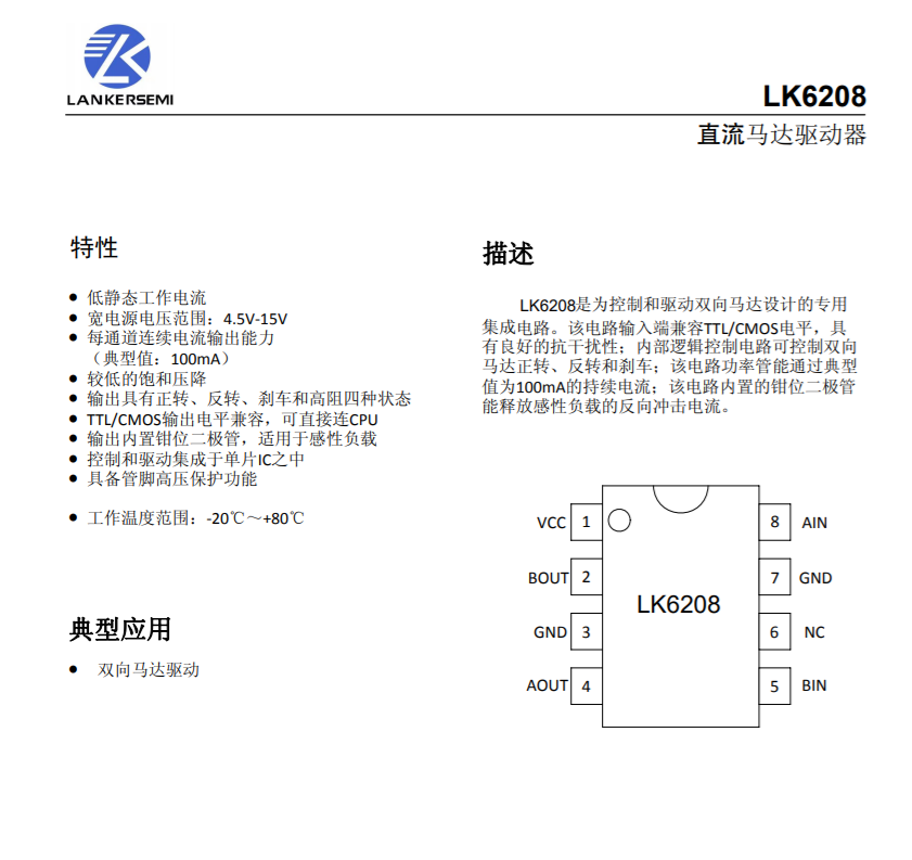 LANKERSEMI兰科LK6208直流马达驱动器,是为控制和驱动双向马达设计的专用集成电路。该电路输入端兼容TTL/CMOS电平,具有良好的抗干扰性;内部逻辑控制电路可控制双向马达正转、反转和刹车;该电路功率管能通过典型值为100mA的持续电流;该电路内置的钳位二极管能释放感性负载的反向冲击电流。