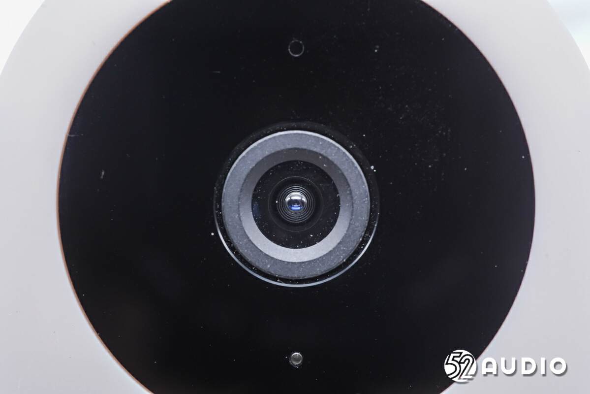 摄像头特写,四周设置红外夜视灯开孔,上方有麦克风拾音孔,下方有指示灯。