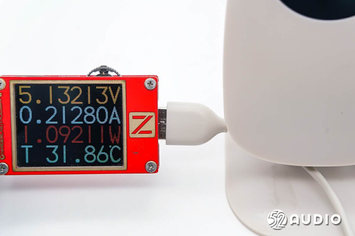 我爱音频网采用CHARGERLAB POWER-Z KM002C对Nooie Baby Cam儿童监护器进行电源输入测试,输入电压约为5.13V,输入电流约为0.21A,输入功率约为1.09W。