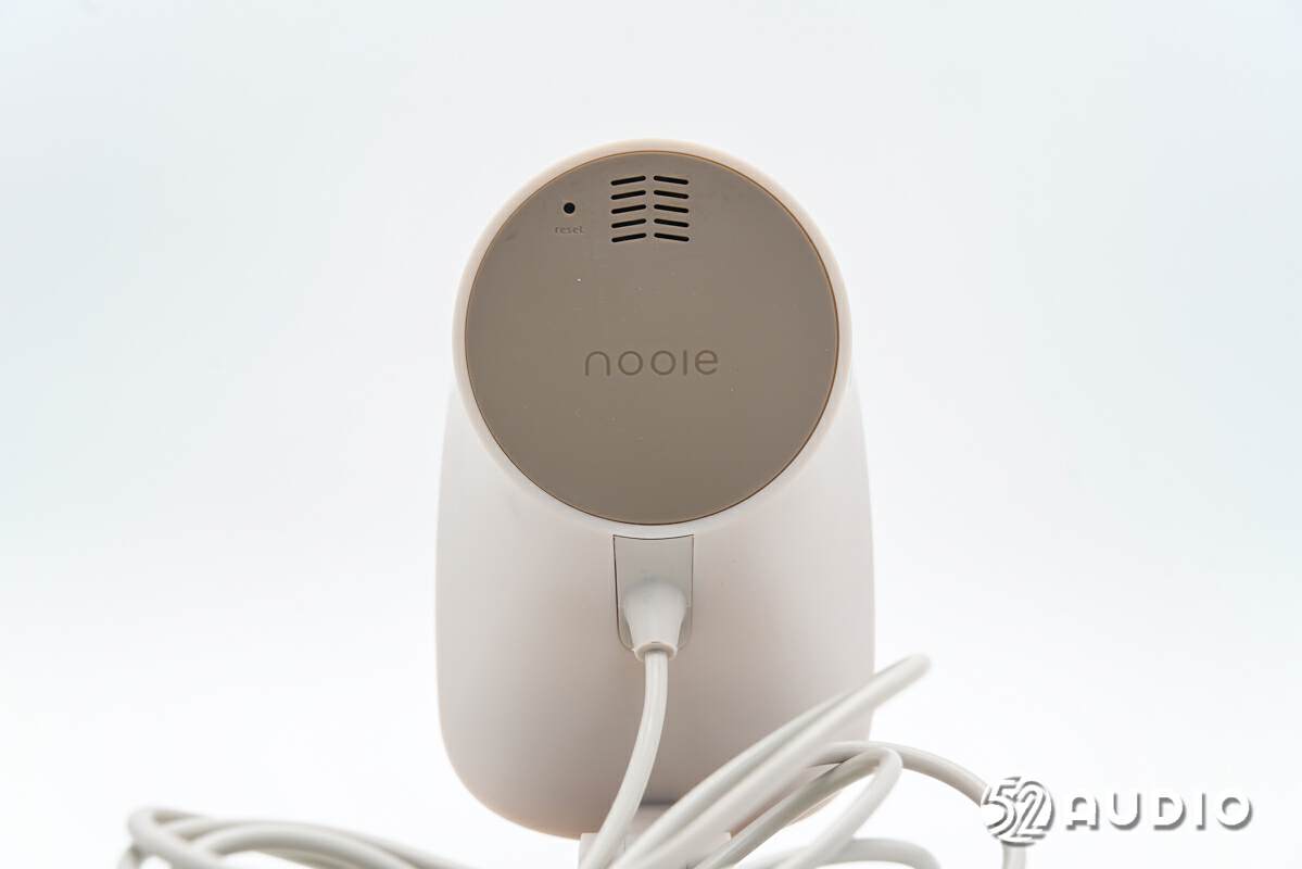 机身背面设置有扬声器出音孔和重置按键开孔,以及“Nooie”品牌LOGO。