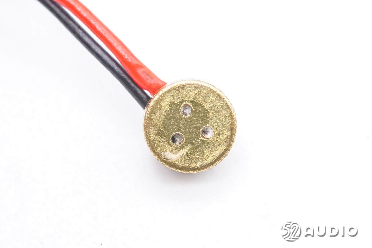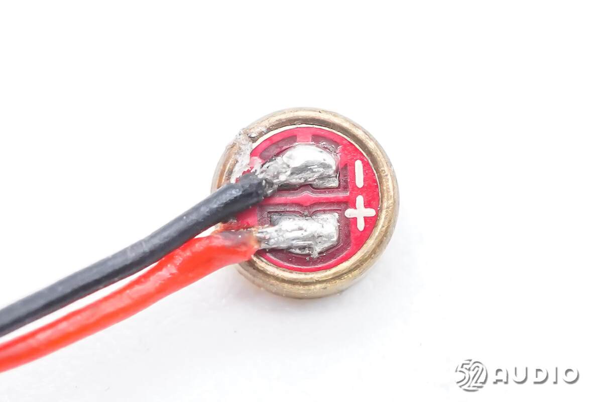驻极体麦克风背面特写,导线焊接。