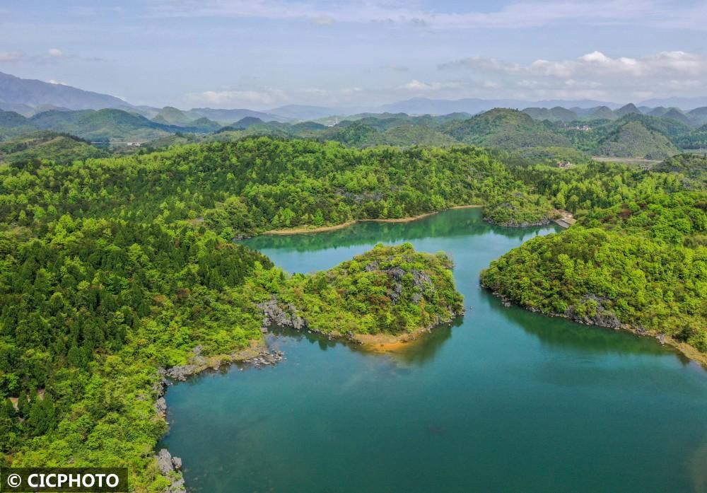↑2022年3月28日在湖南省常宁市三角塘镇大义山水库拍摄的景色。(无人机照片)CICPHOTO/刘东华 摄