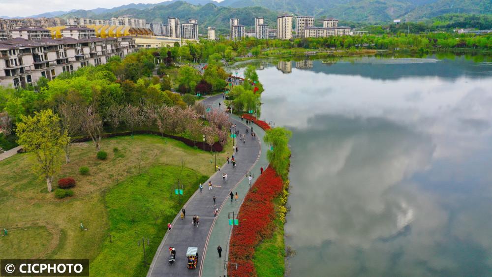 ↑2022年3月27日,重庆市梁平区双桂湖国家湿地公园内,人们在健身步道上赏景游玩。(无人机照片)CICPHOTO/刘辉 摄