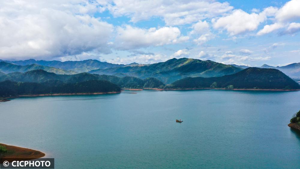 ↑2022年3月25日,保洁员在湖南省常宁市洋泉镇洋泉水库水面上巡库护水。(无人机照片)CICPHOTO/周秀鱼春 摄